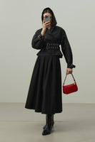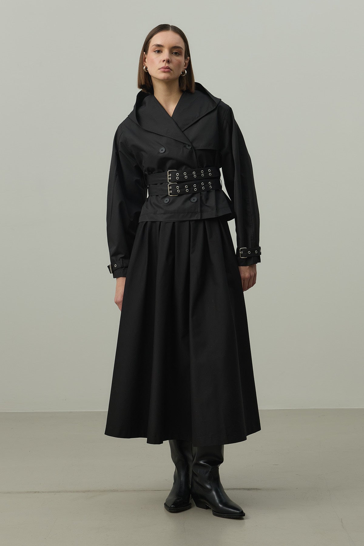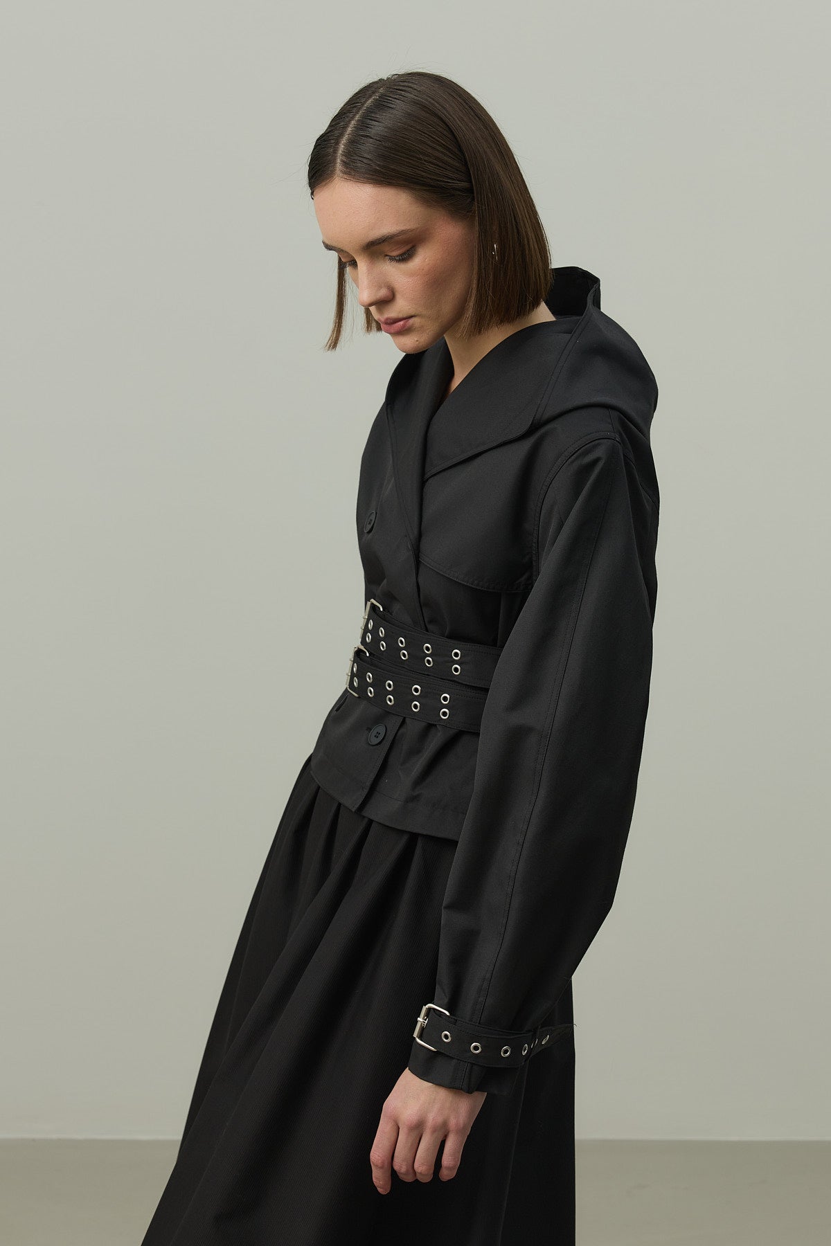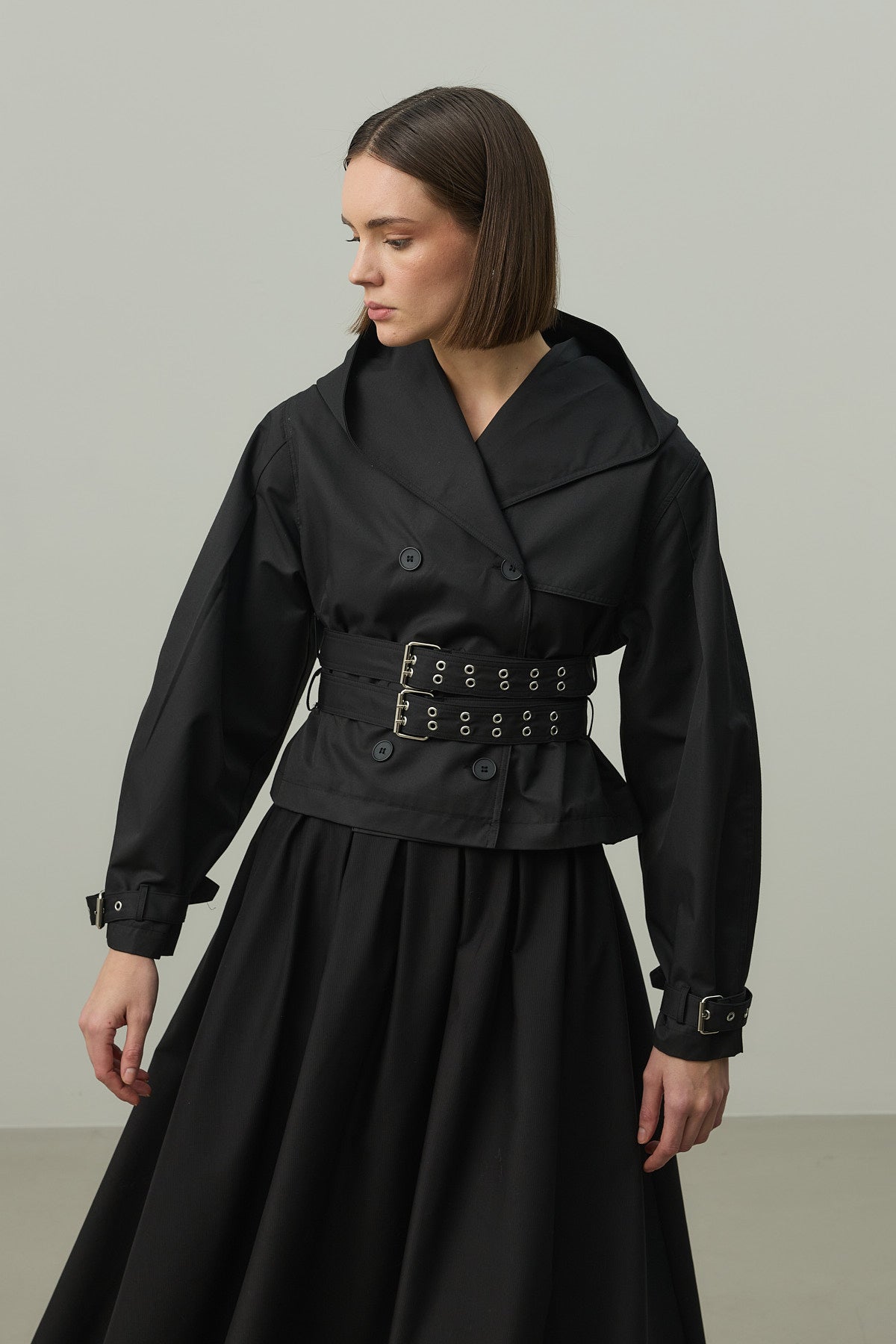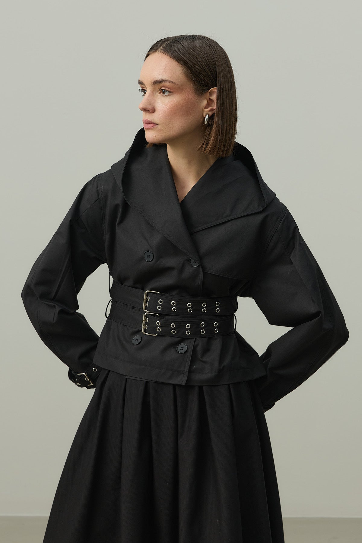 Kapüşonlu Kemerli Trenç Ceket Siyah