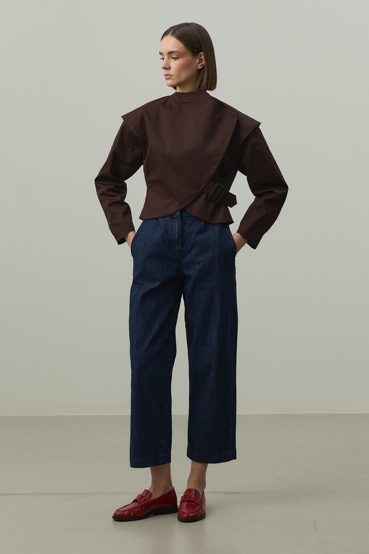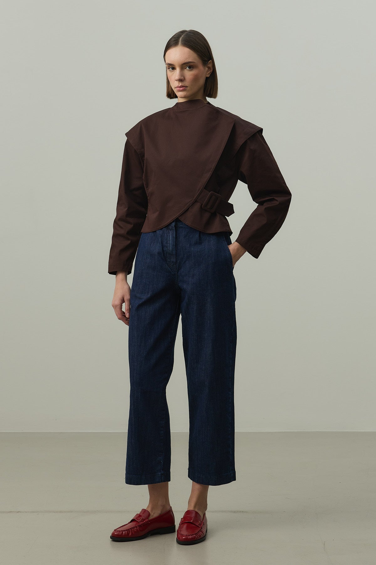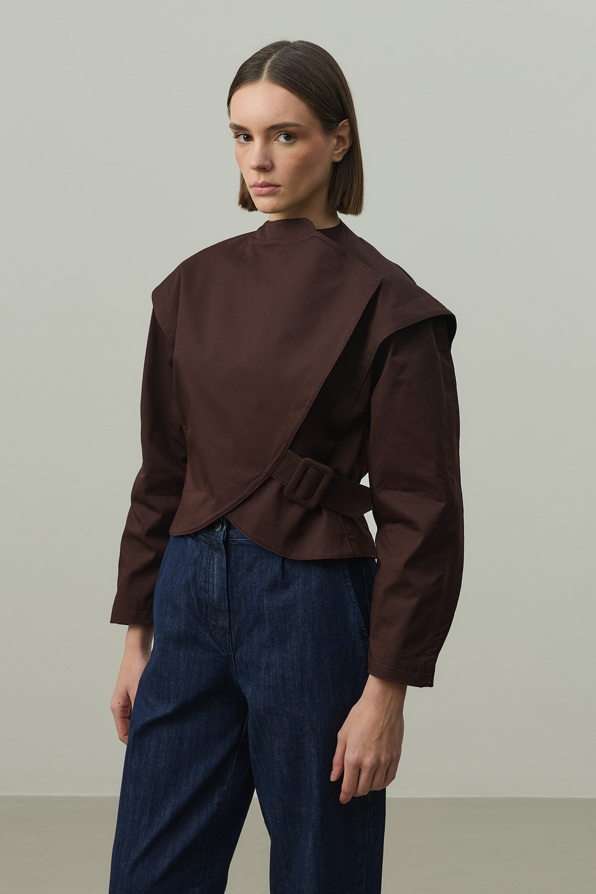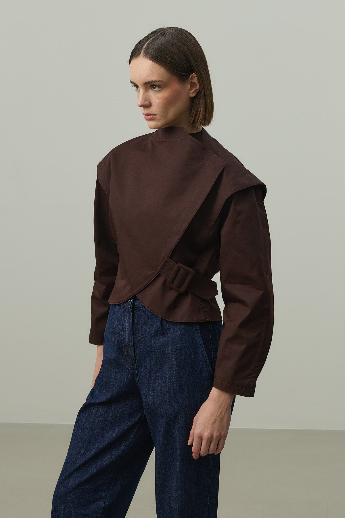 Sık dokuma kumaştan, astarlı, omuz ve kol detaylı, kemer tokalı, önü içten tek çıtçıt kapamalı ceket