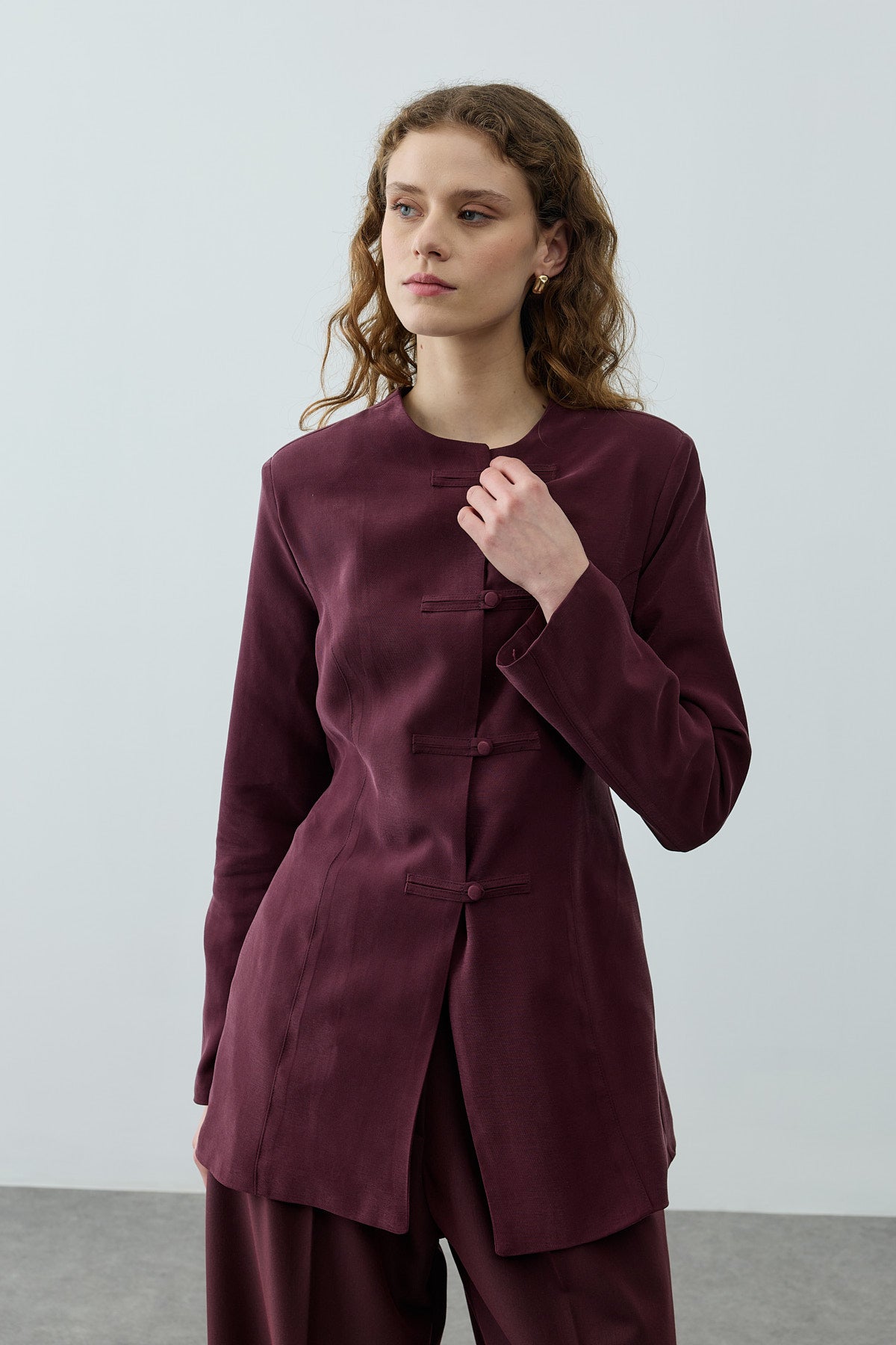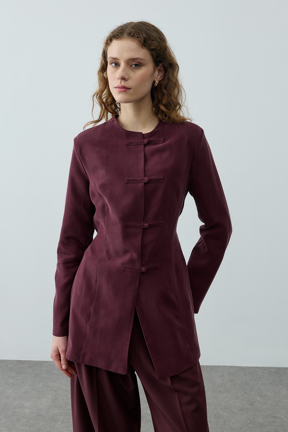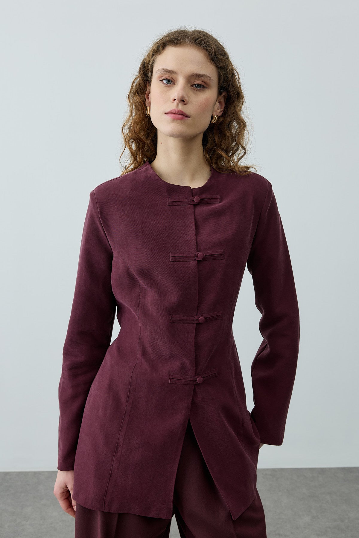 Tensel dokuma kumaştan, önü brit kapama detaylı, bisiklet yakalı, uzun geniş kollu, astarlı ceket.