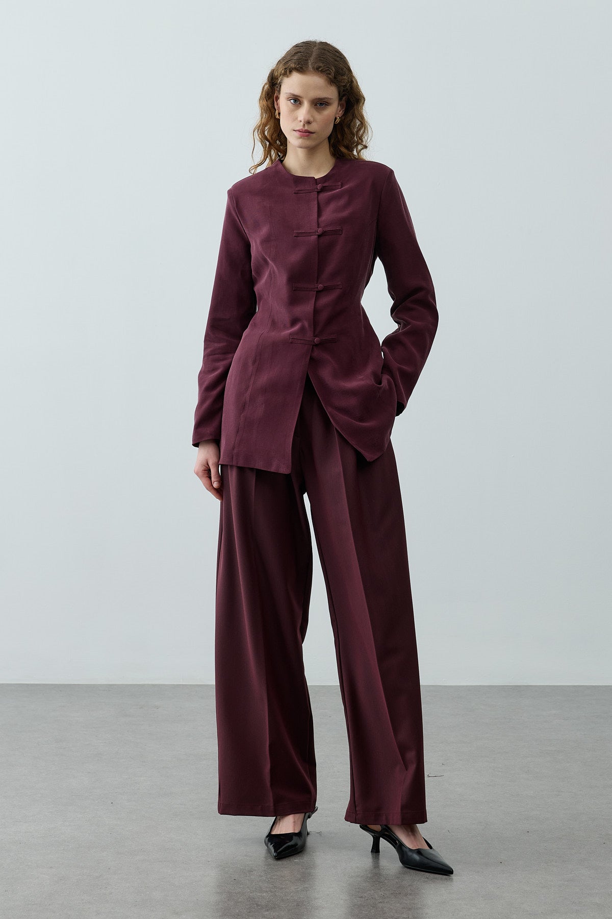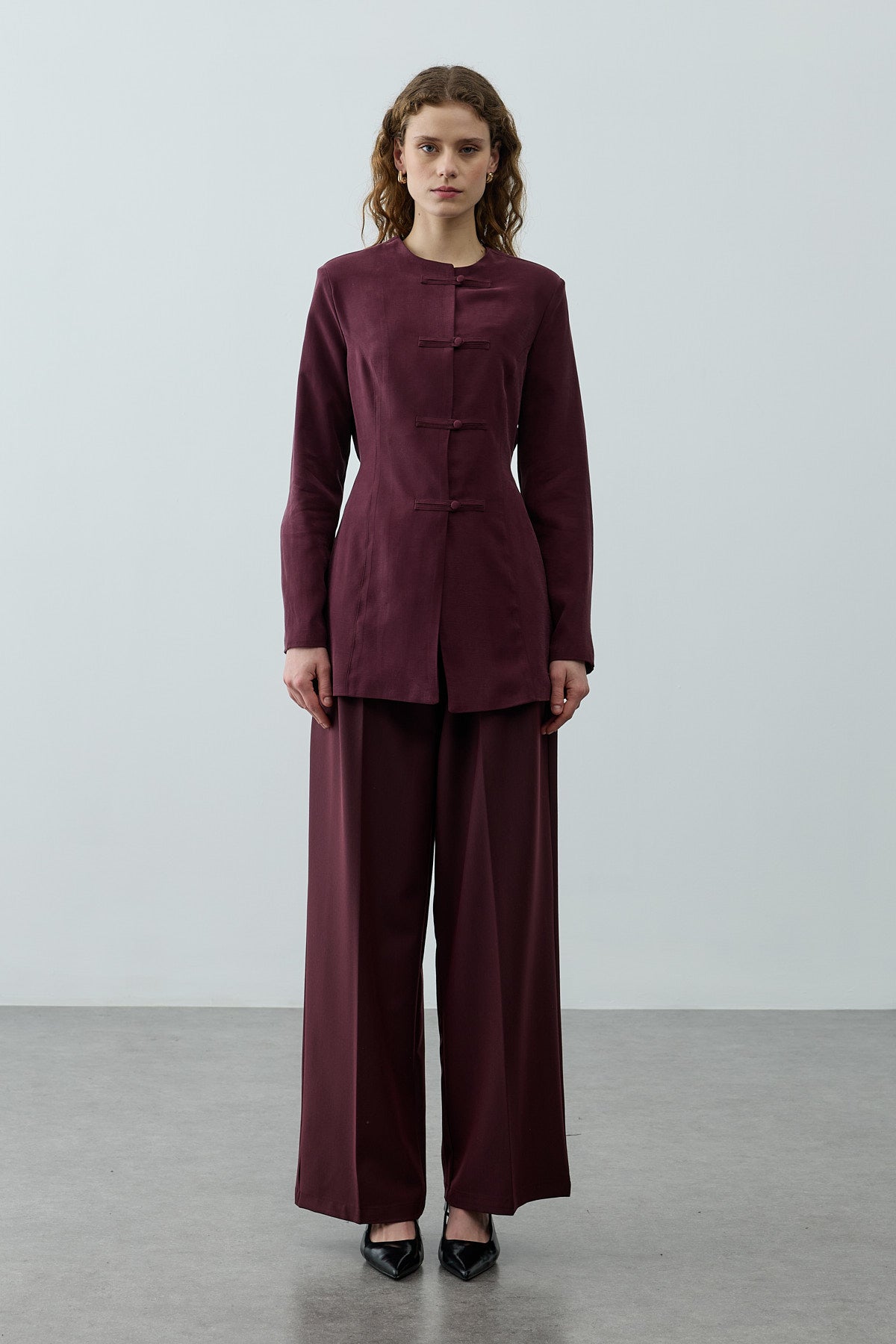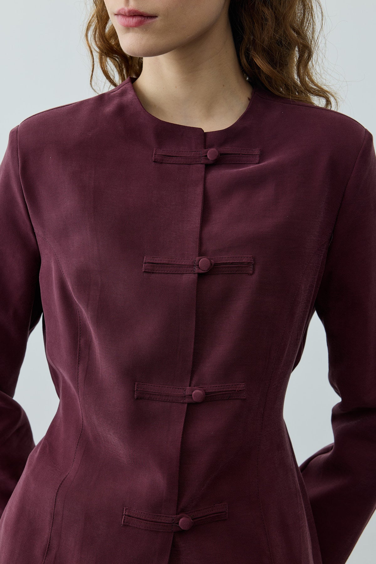 Tensel dokuma kumaştan, önü brit kapama detaylı, bisiklet yakalı, uzun geniş kollu, astarlı ceket.