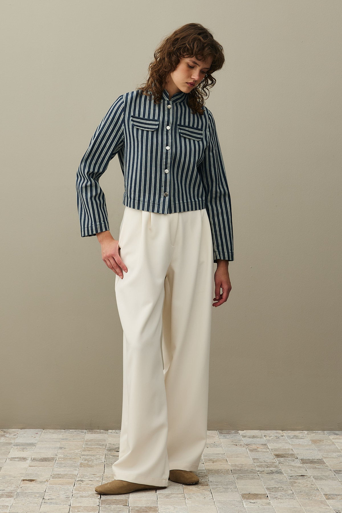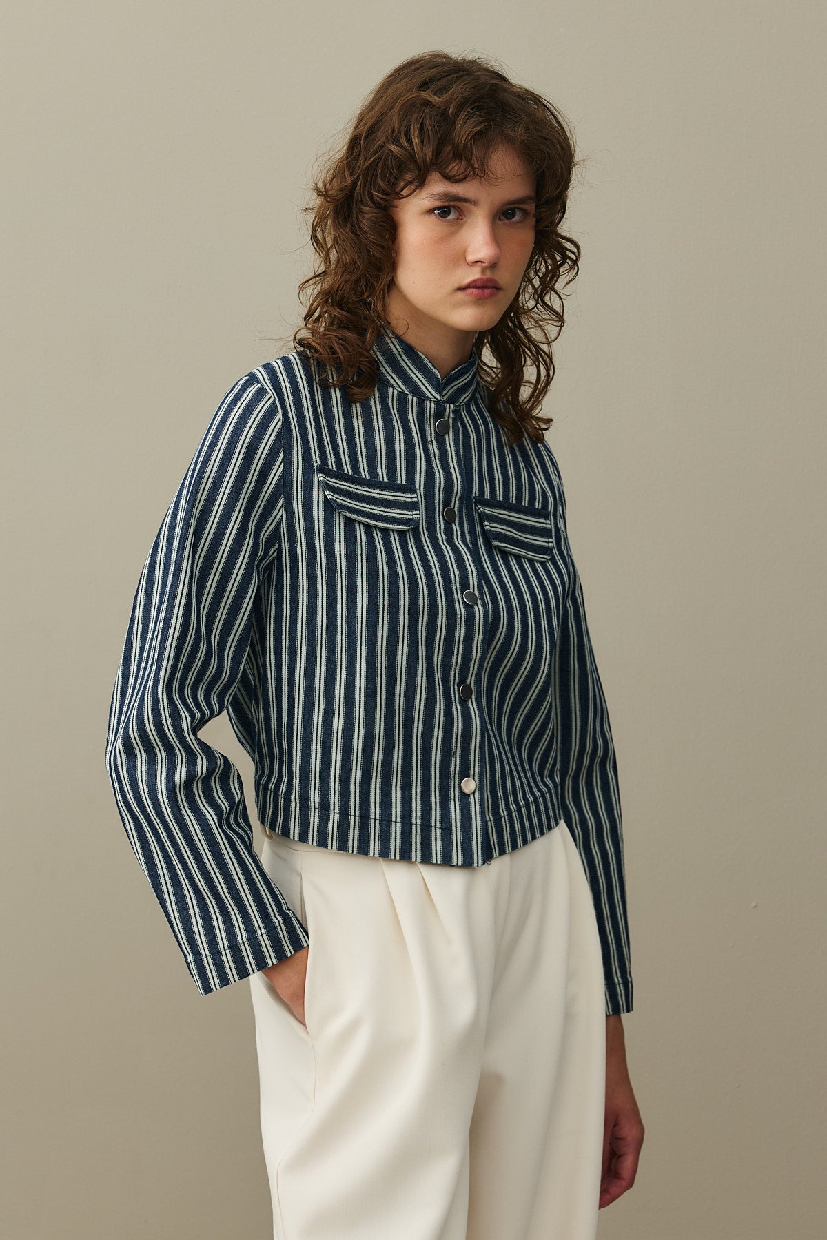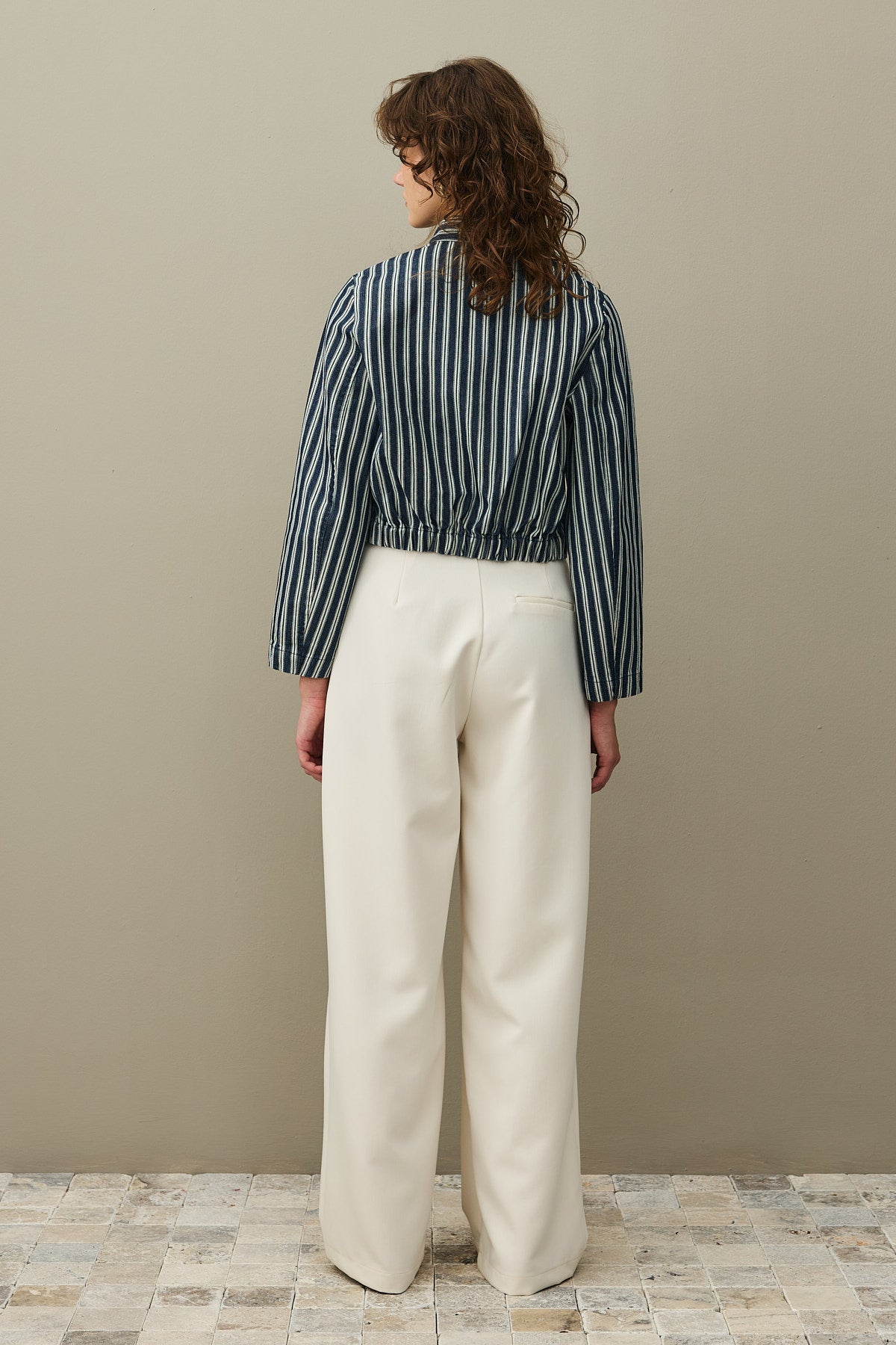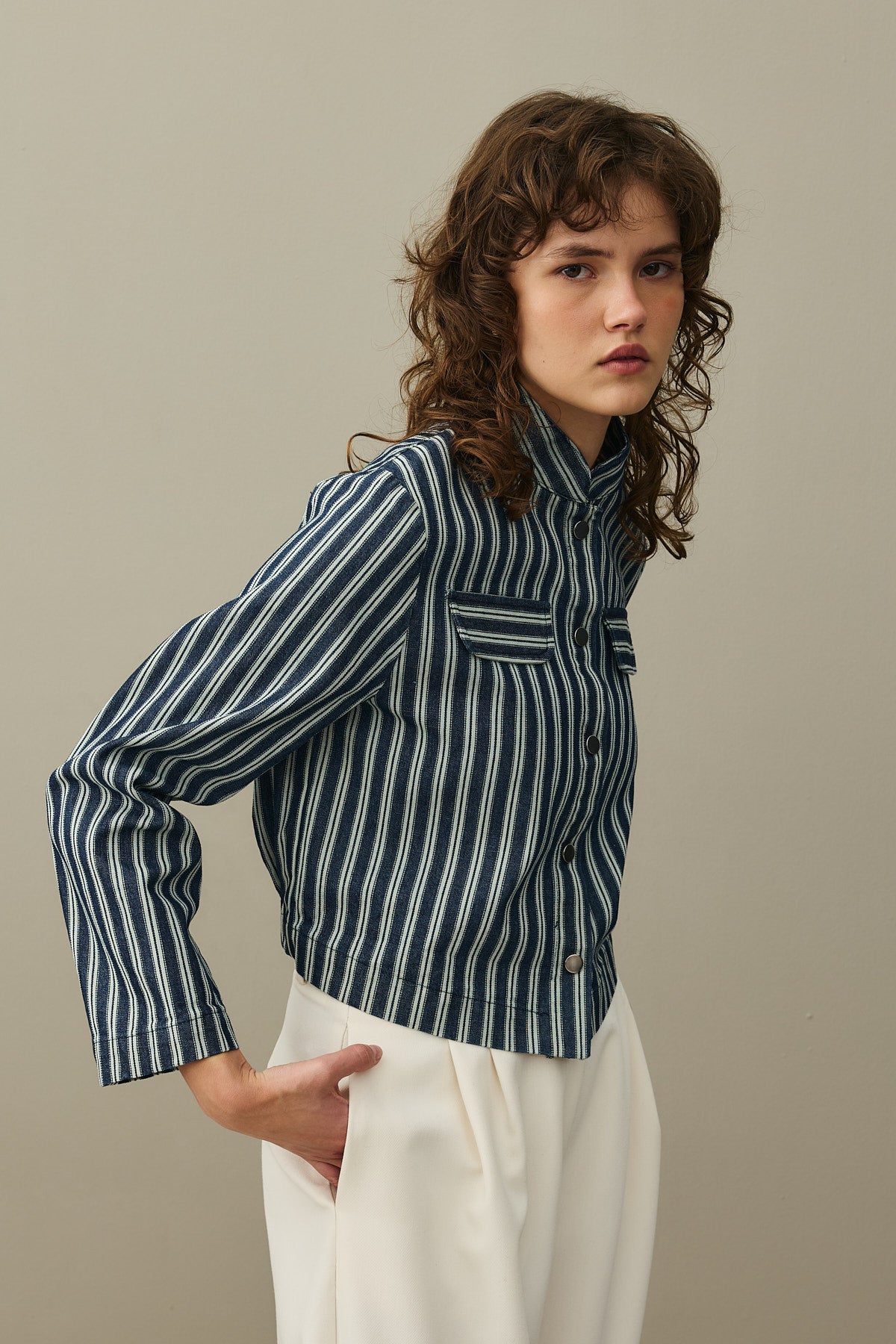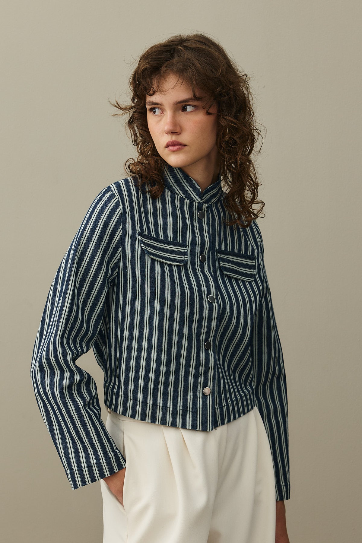 Çizgili Denim Bomb Ceket Koyu Mavi