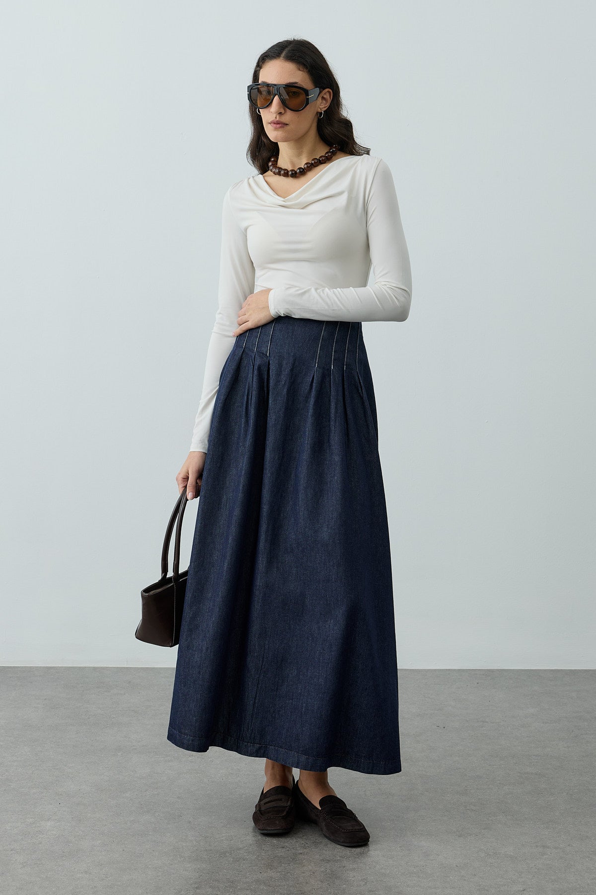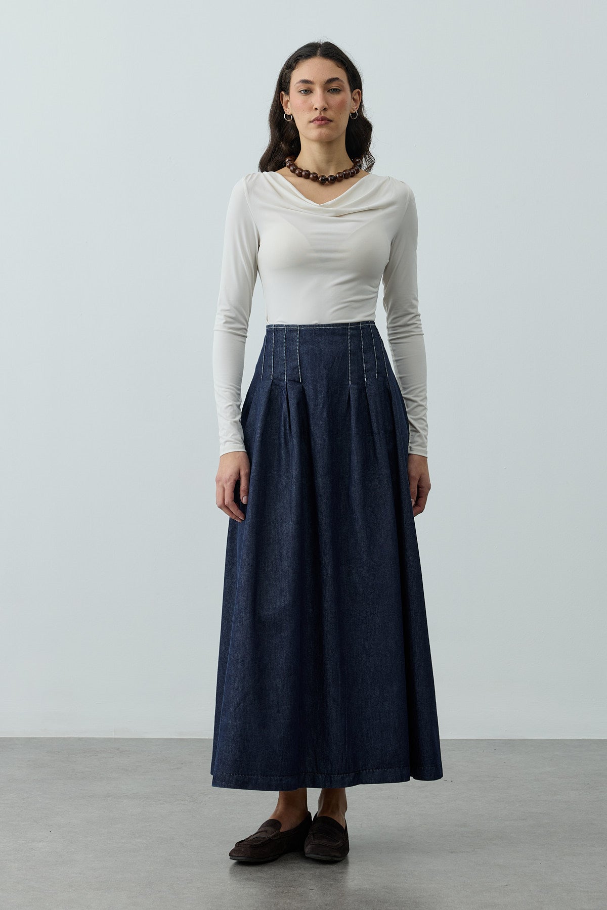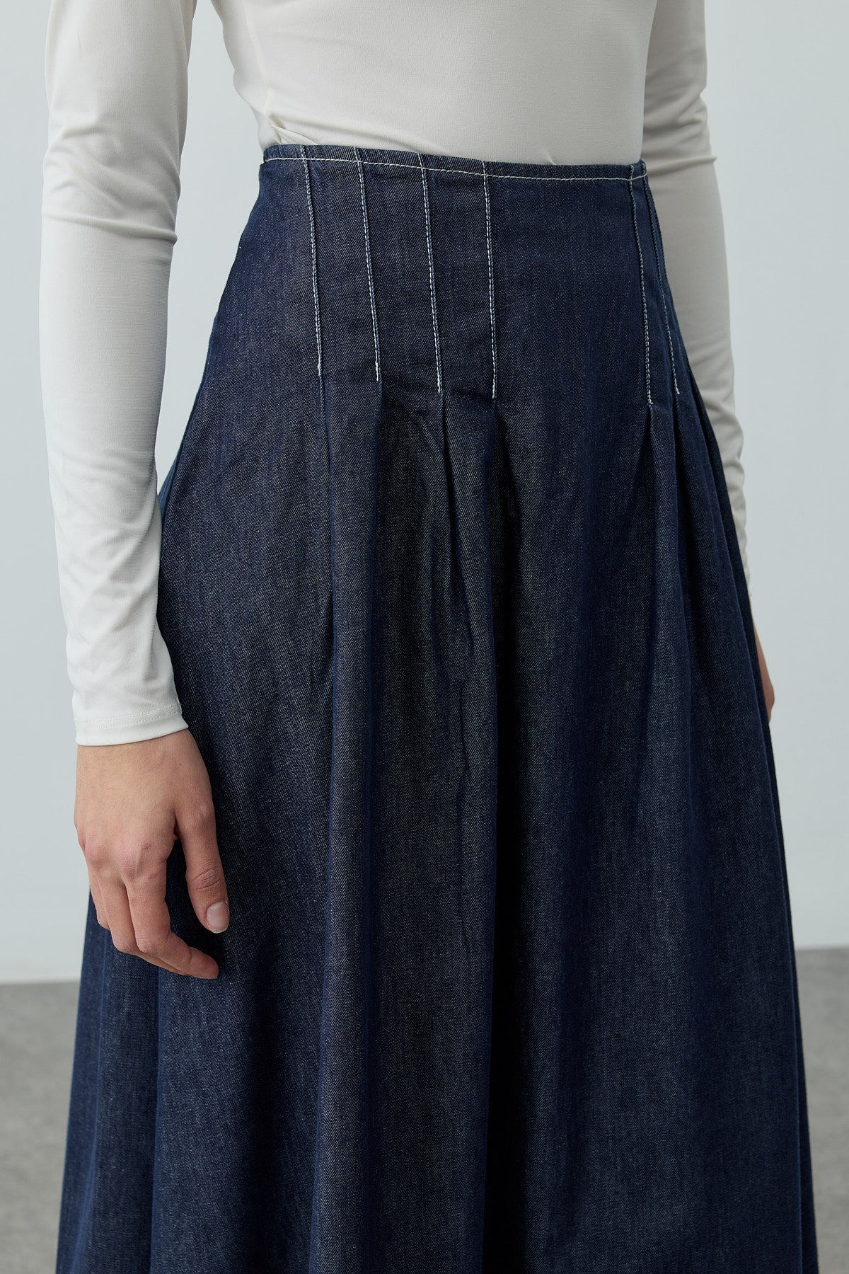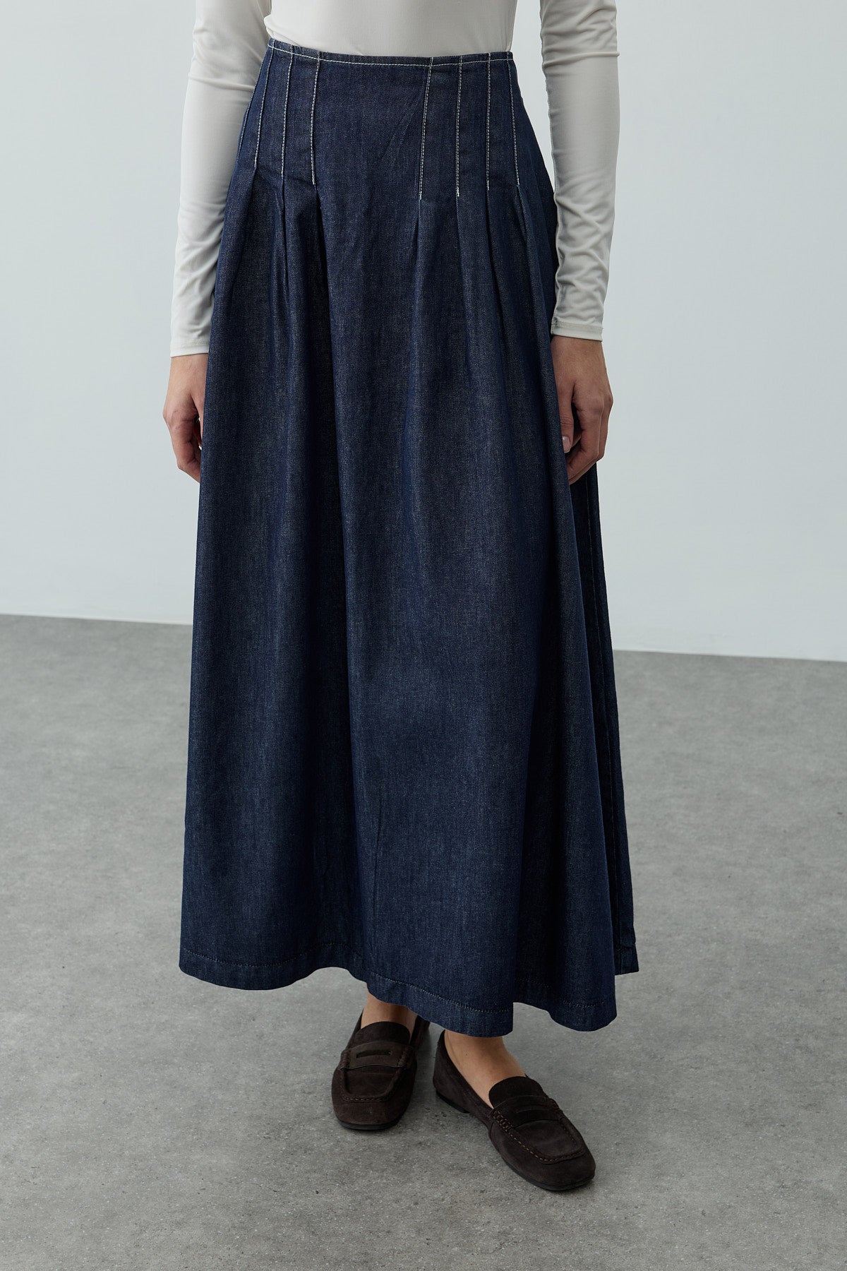 Denim dokuma kumaştan, yüksek belli, belirgin dikiş ve pilili detaylar,  gizli fermuar kapamalı, maxi boy etek.