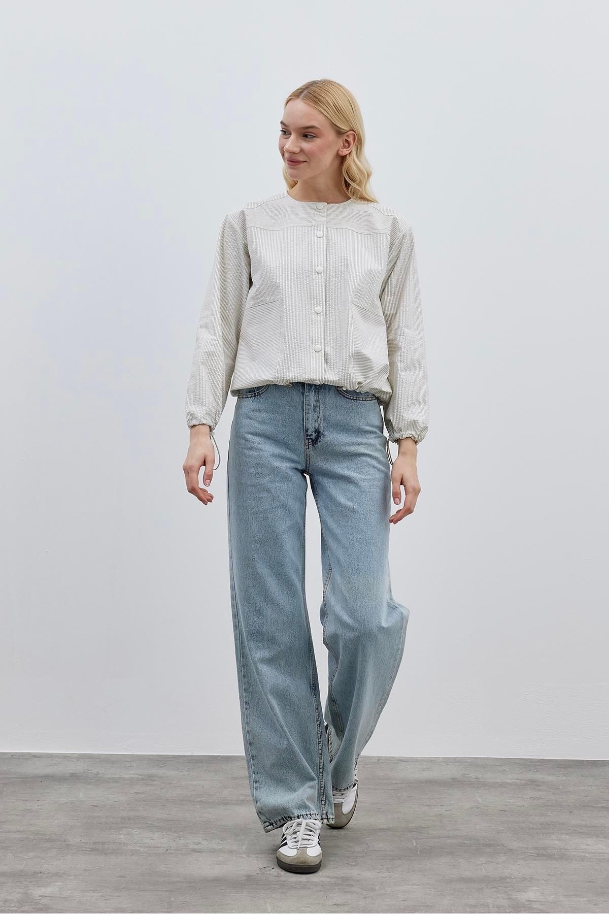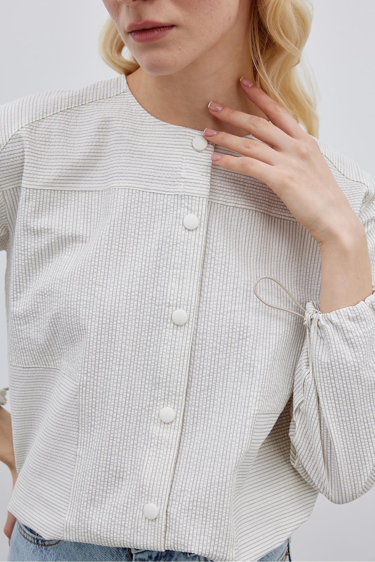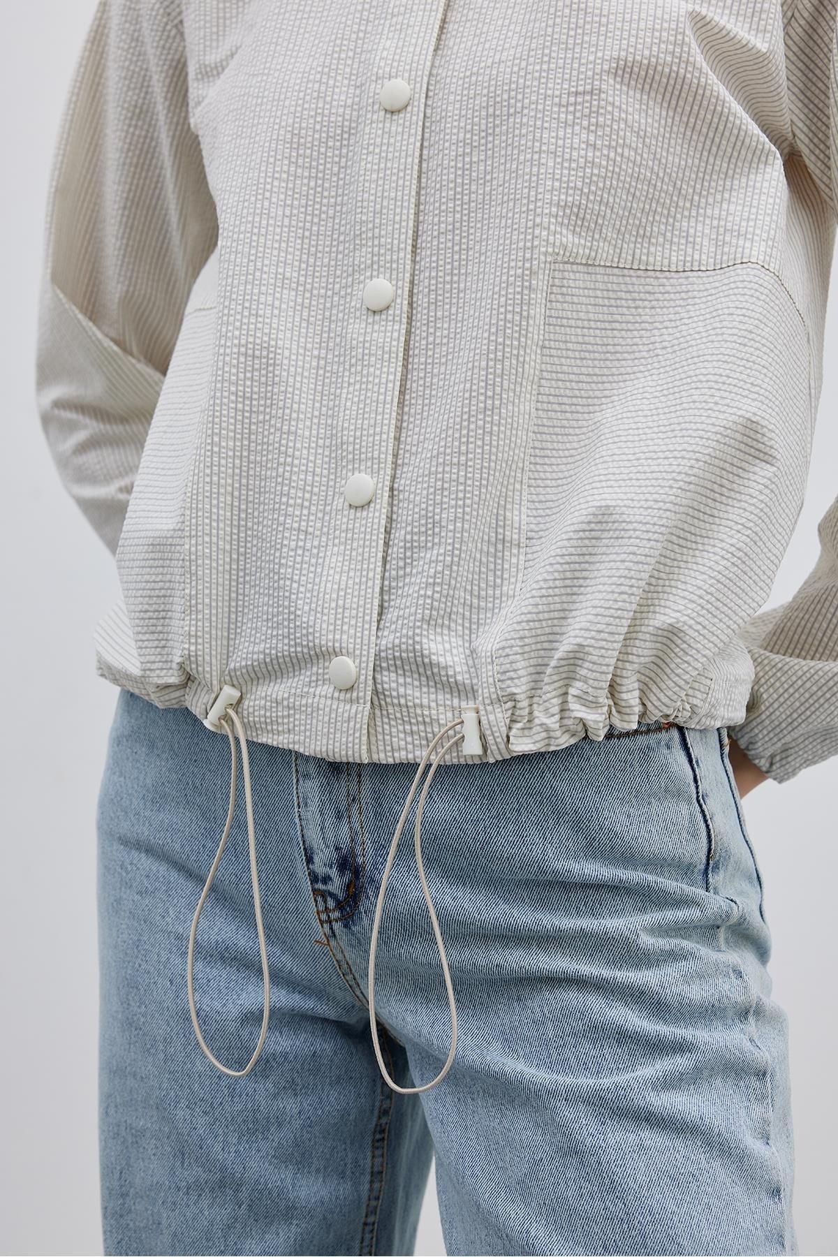 Striped woven fabric, shirt jacket with snap fastener on the front, elastic at the cuffs and hem, and stopper; Model Measurements Length: 1; 77 cm, Size: 36 1 (36; 38) Size: Length: 58 cm, Distance Between Shoulders: 46 cm, Chest: 52 cm, Sleeve Length: 54 cm 2 (40; 42) Size: Length: 58 cm, Distance Between Shoulders: 46 cm, Chest: 54 cm, Sleeve Length: 55 cm;