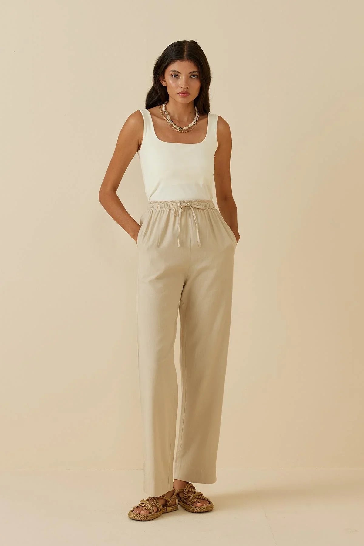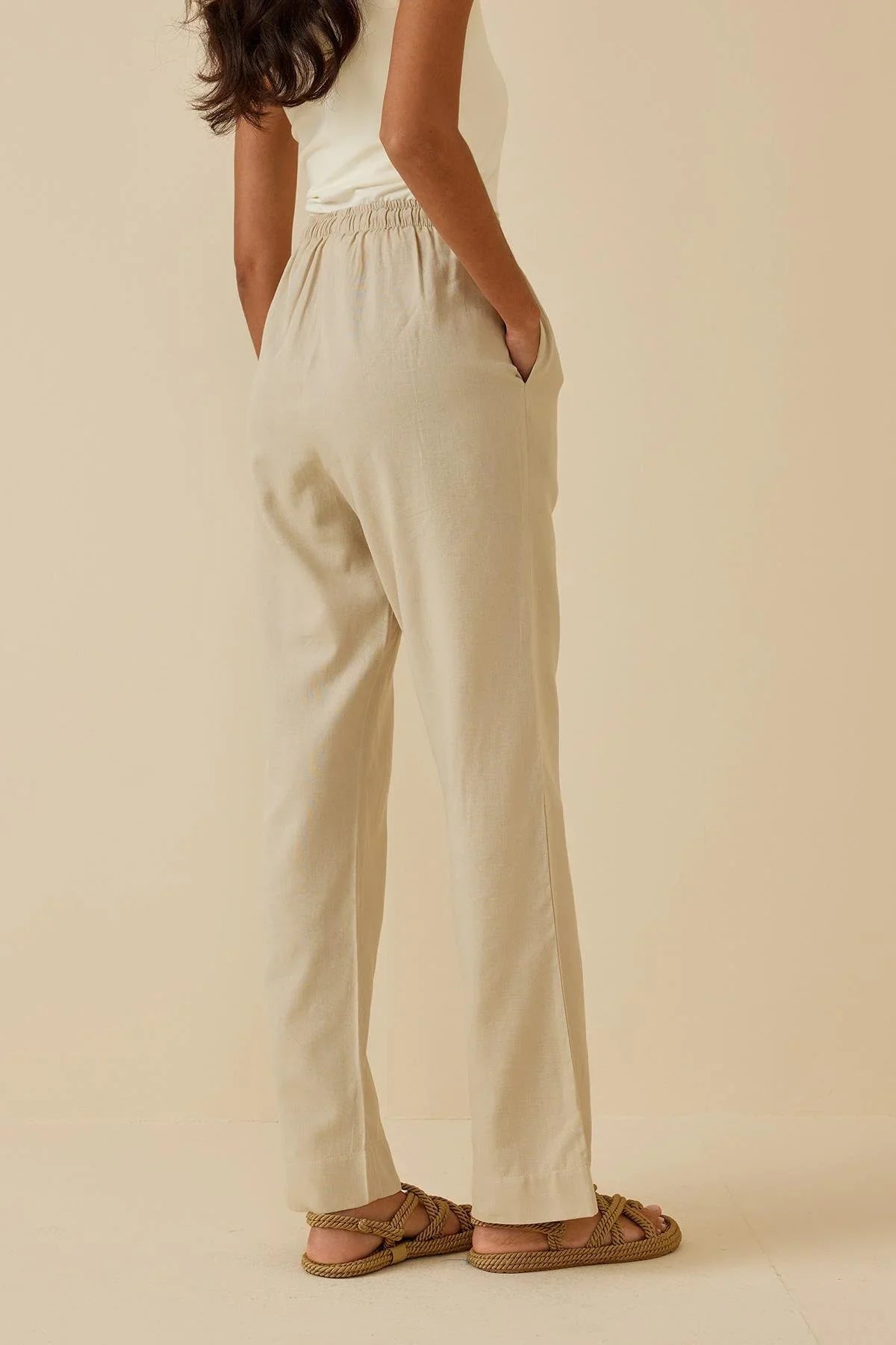 Straight-cut trousers crafted in a linen weave with a narrow elasticated waist and adjustable britched belt.