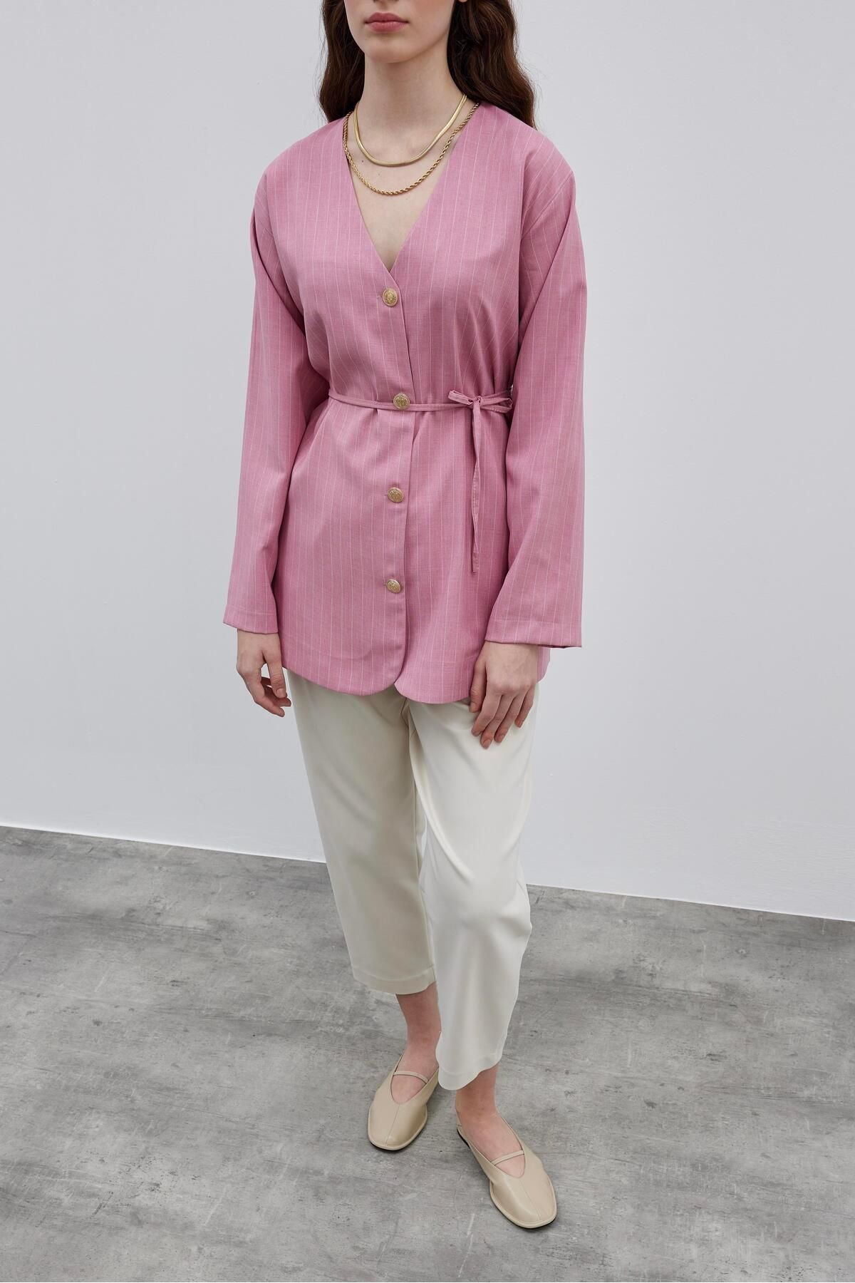 Polyviscone fabric, v-neck, metal button fastening, removable bias belt, back slit detailed jacket. ; Model Measurements Height: 1.77 cm, Size: 36. ; 1 (36/38) SIZE Length: 75cm, Sleeve Length: 53cm, Distance Between Shoulders: 43cm, Chest: 53cm 2 (40/42) SIZE Length: 75cm, Sleeve Length: 56 cm, Distance Between Shoulders: 45cm, Chest: 55cm;