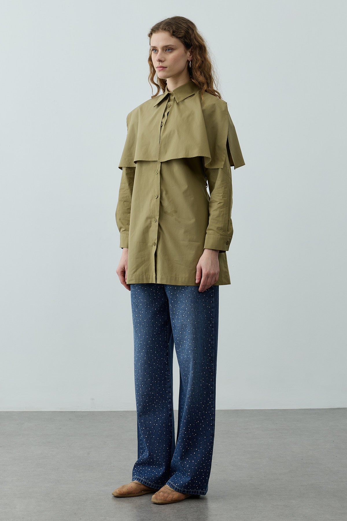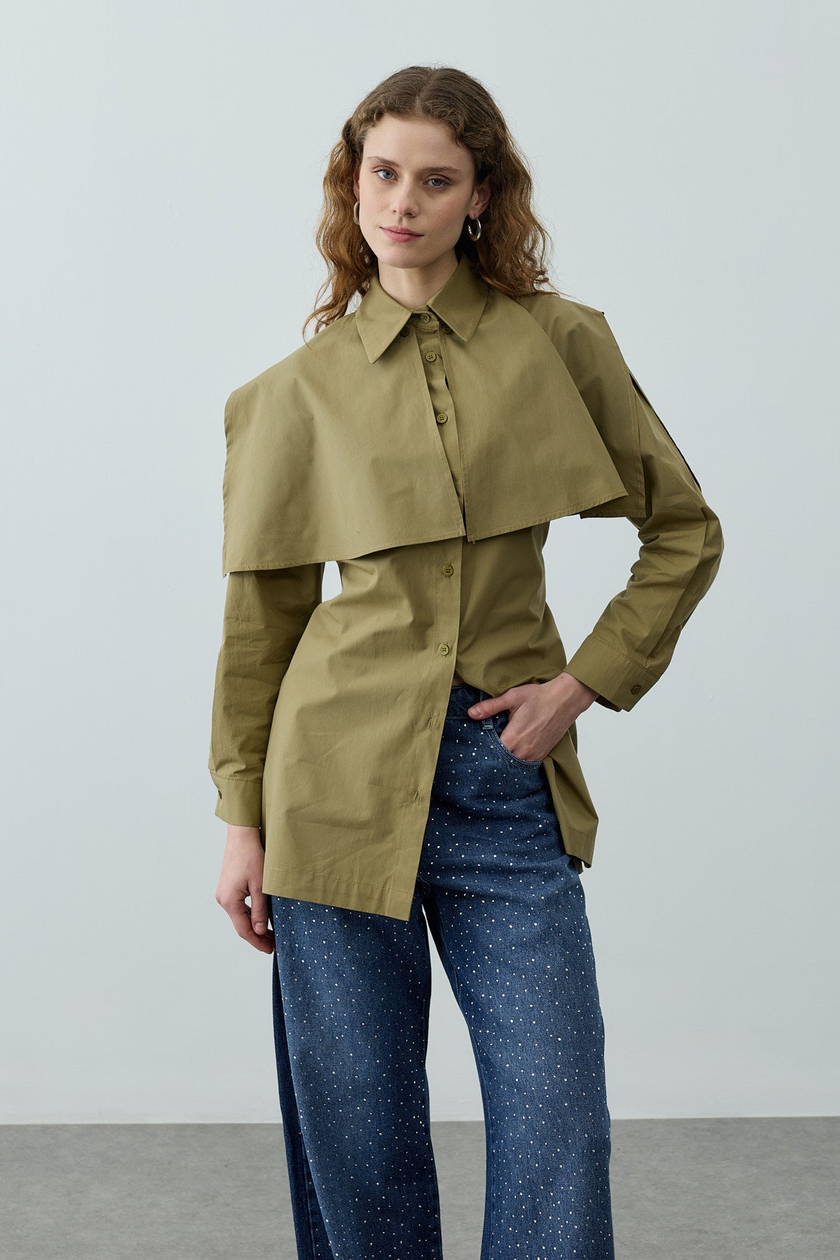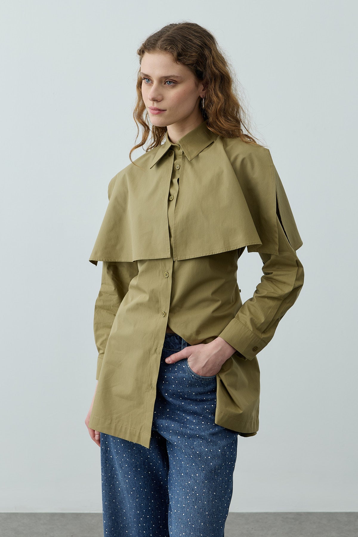 % 100 pamuk dokuma kumaştan, pensli kesimli, takılıp çıkartılabilir pelerinli,uzun kollu, manşetli , önü patlı, düğme kapamalı, ince köprülü, seyyar brit kemerli gömlek.