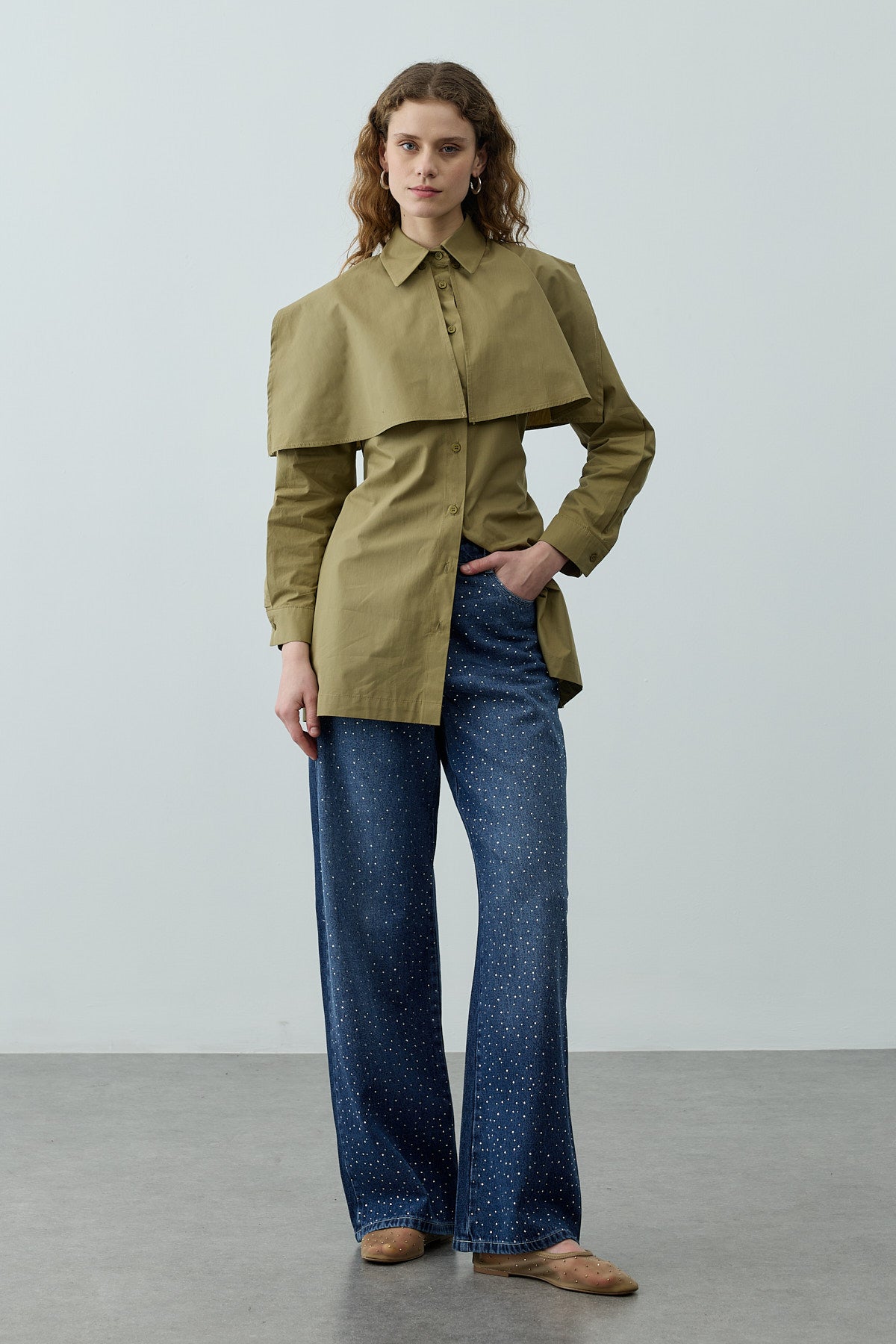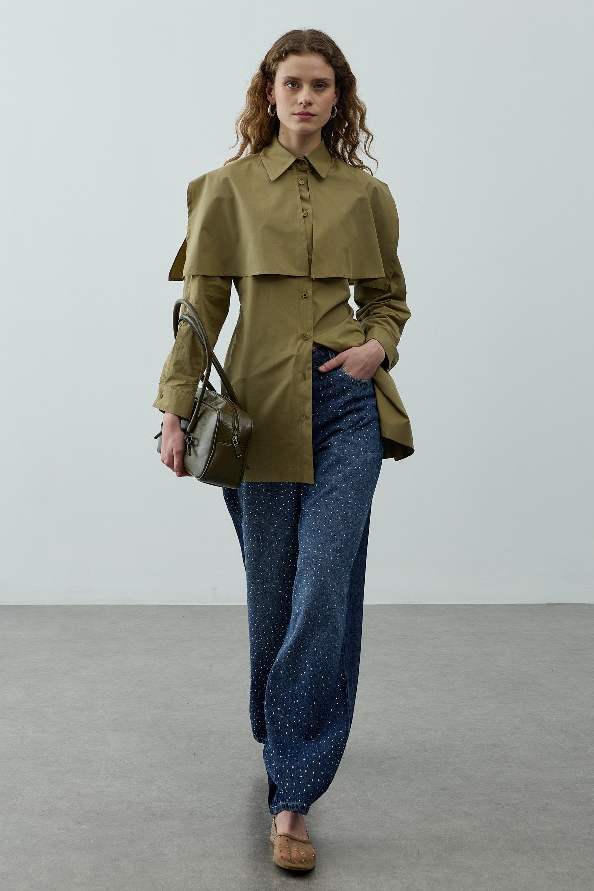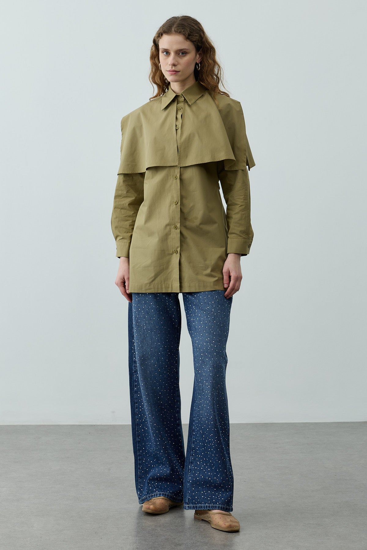 % 100 pamuk dokuma kumaştan, pensli kesimli, takılıp çıkartılabilir pelerinli,uzun kollu, manşetli , önü patlı, düğme kapamalı, ince köprülü, seyyar brit kemerli gömlek.