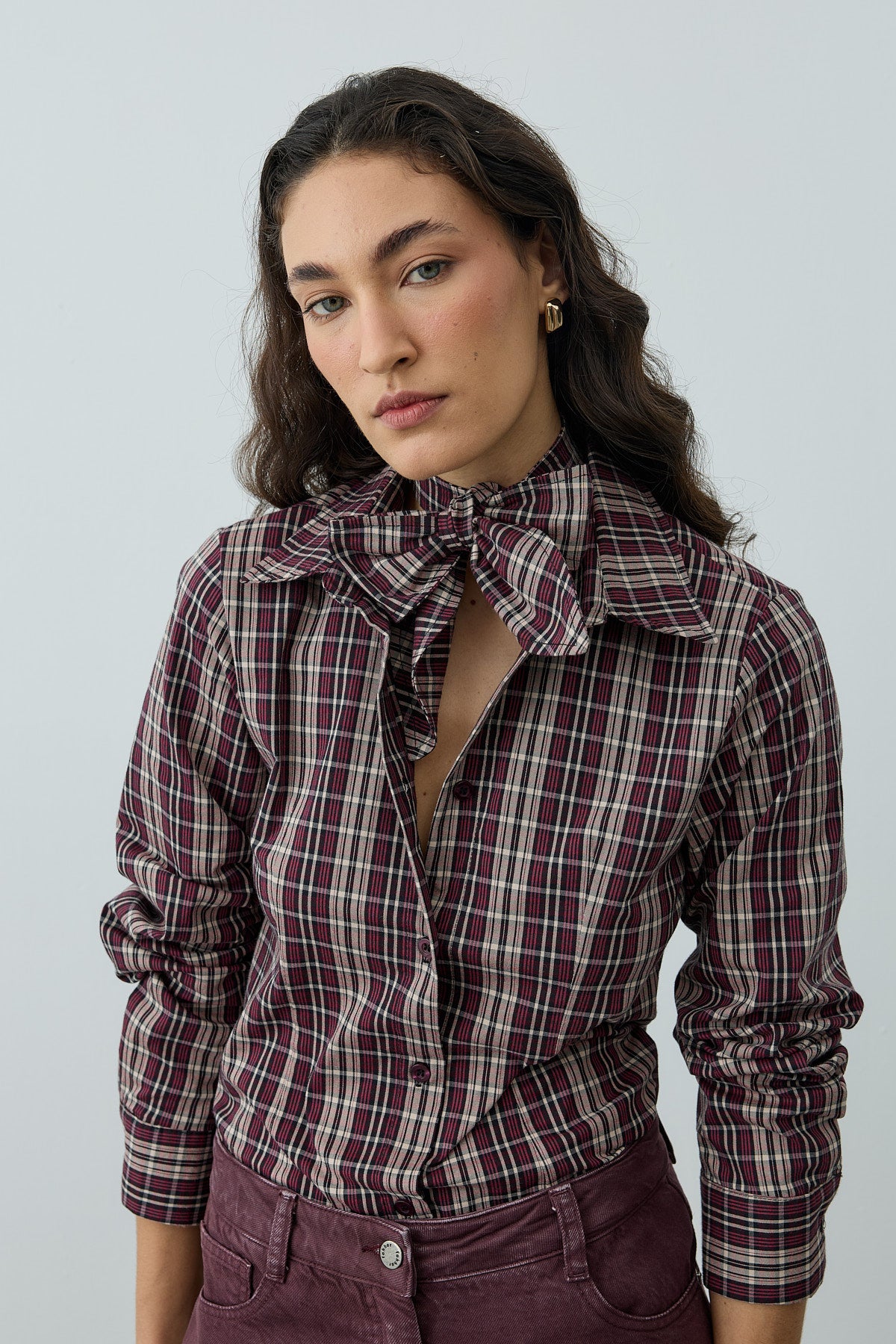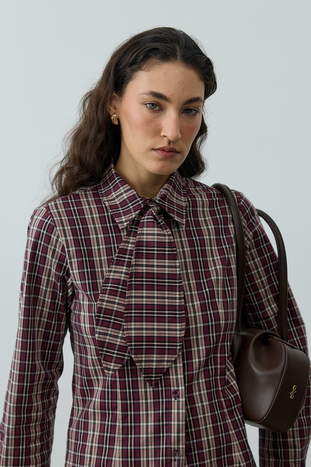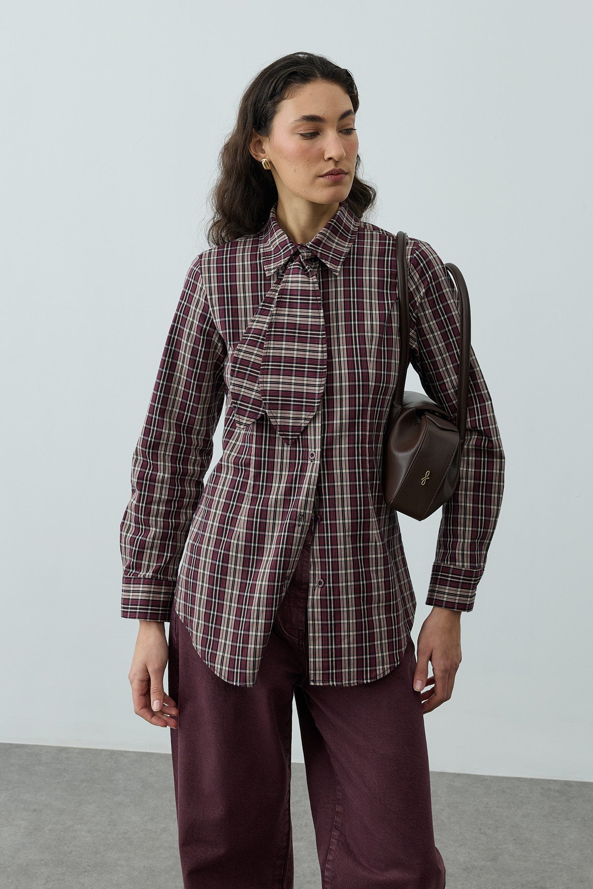 Ekose desenli dokuma kumaştan, seyyar fularlı, gömlek yakalı, önü patlı, düğme kapamalı, uzun kollu, manşetli, pens detaylı gömlek.