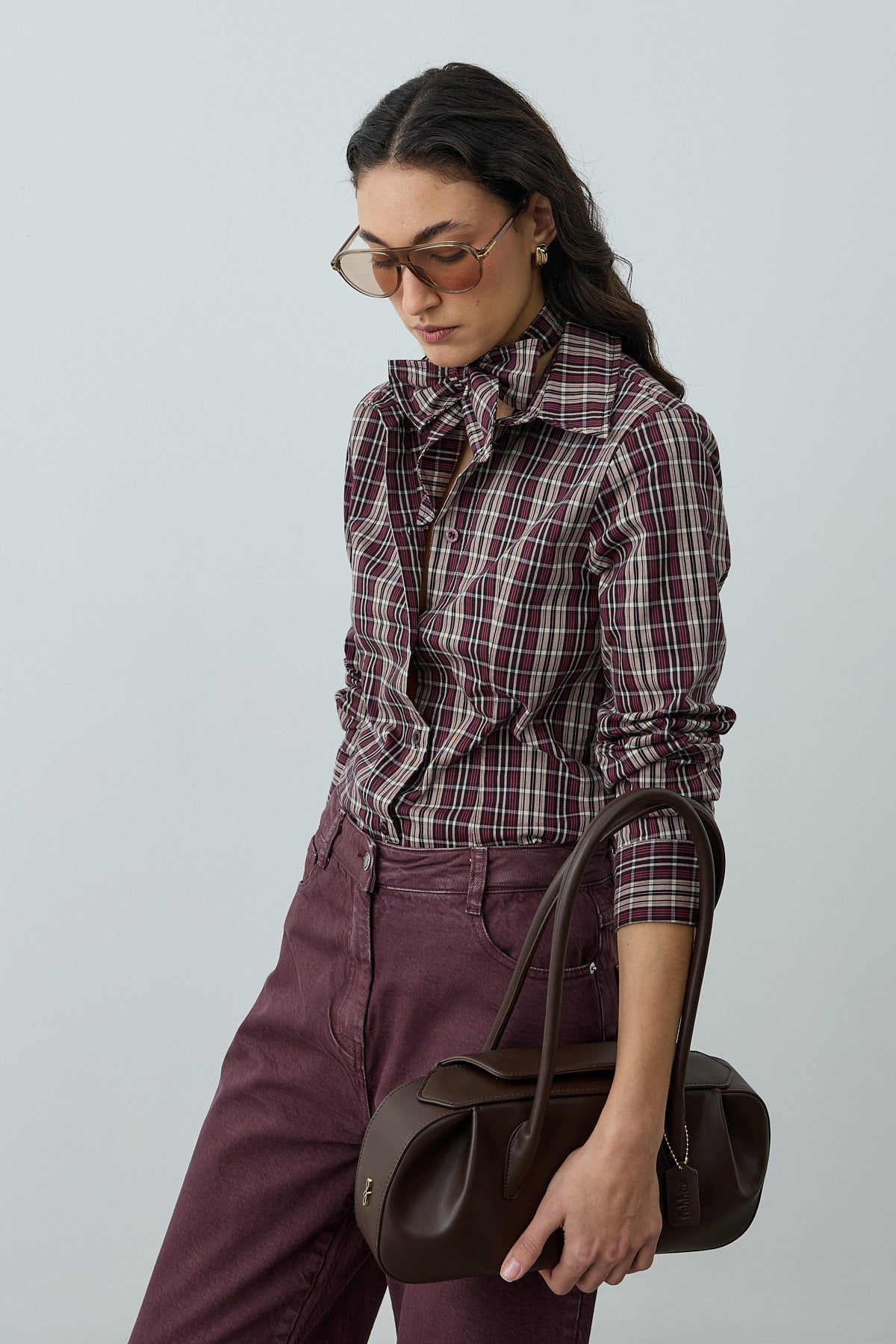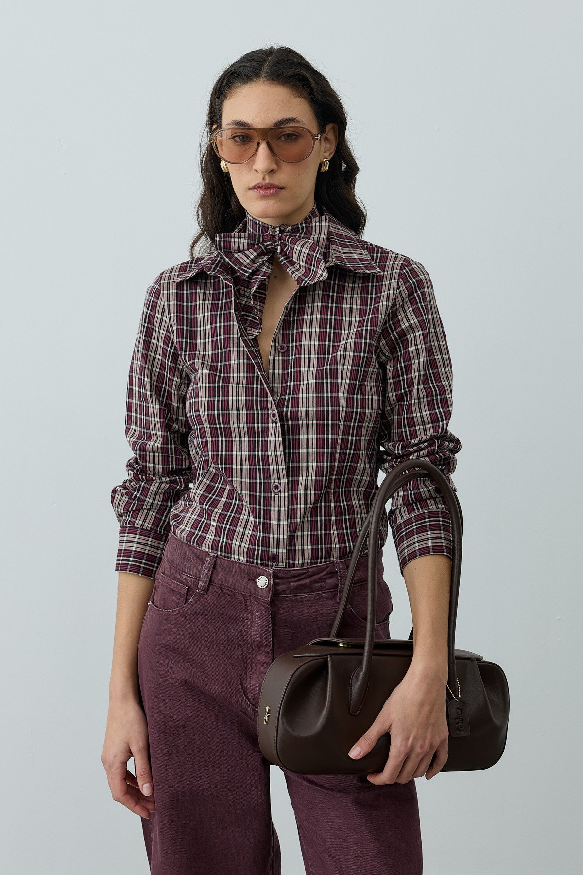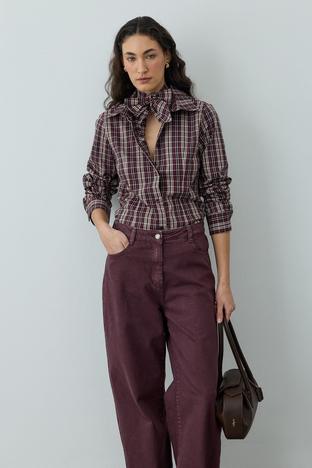 Ekose desenli dokuma kumaştan, seyyar fularlı, gömlek yakalı, önü patlı, düğme kapamalı, uzun kollu, manşetli, pens detaylı gömlek.