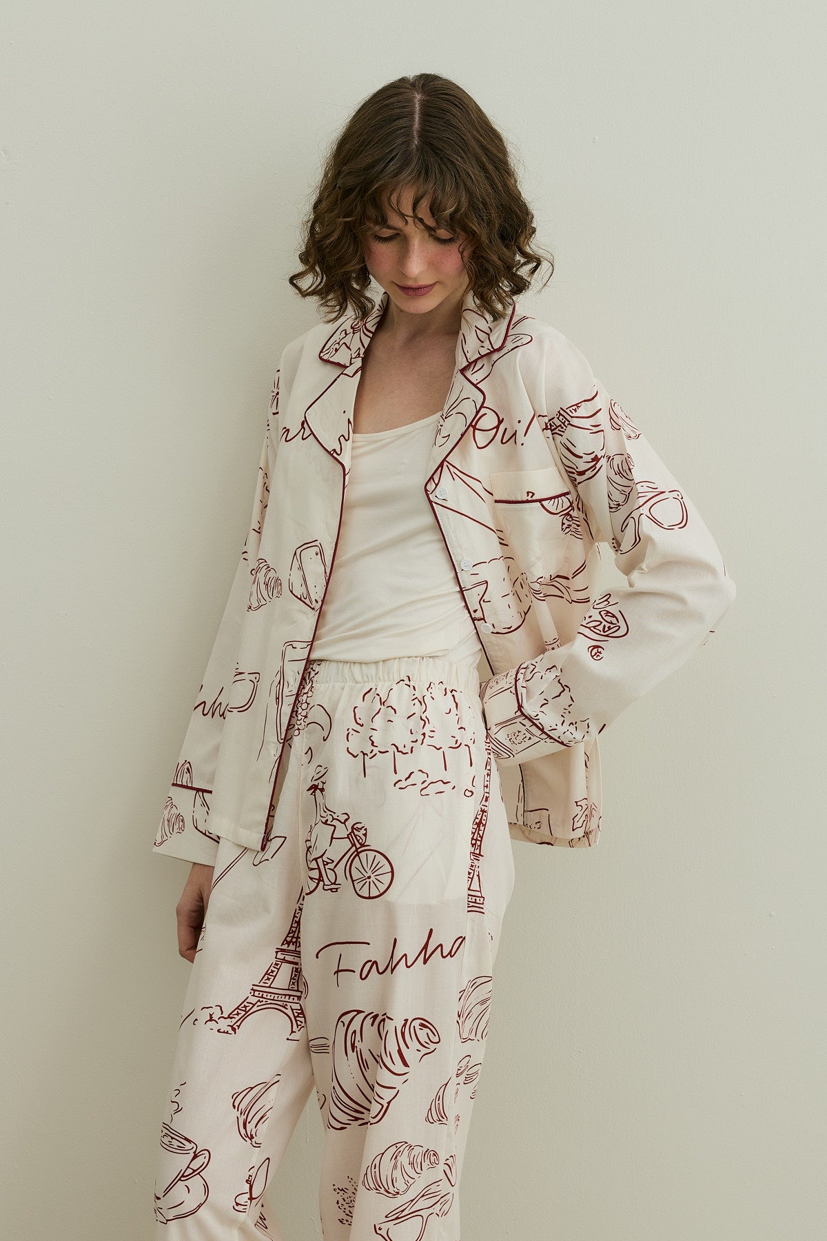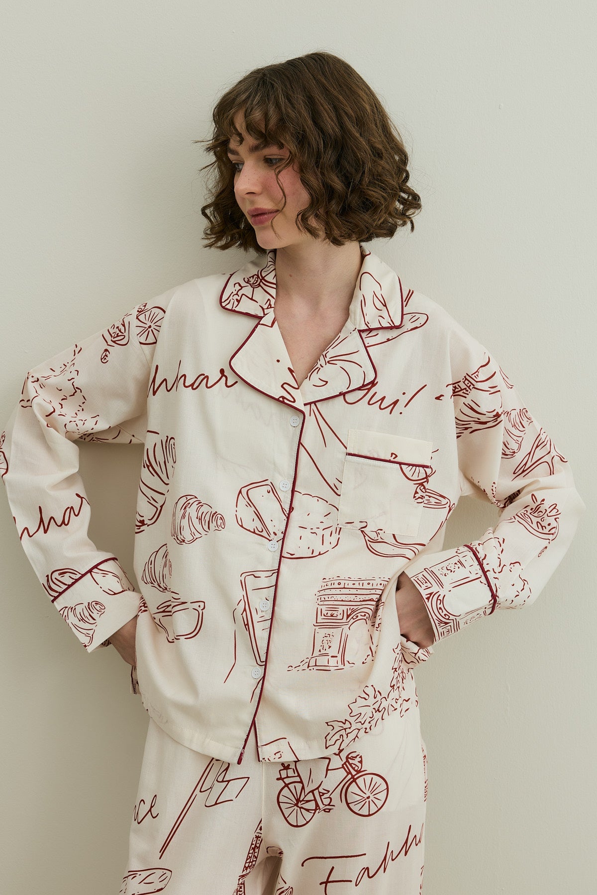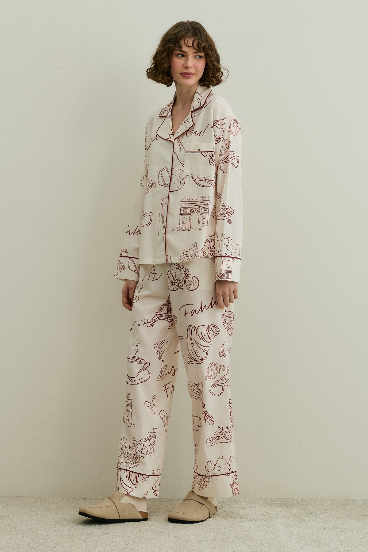 Kruvasan Desen Pamuk Pijama Takımı Ekru