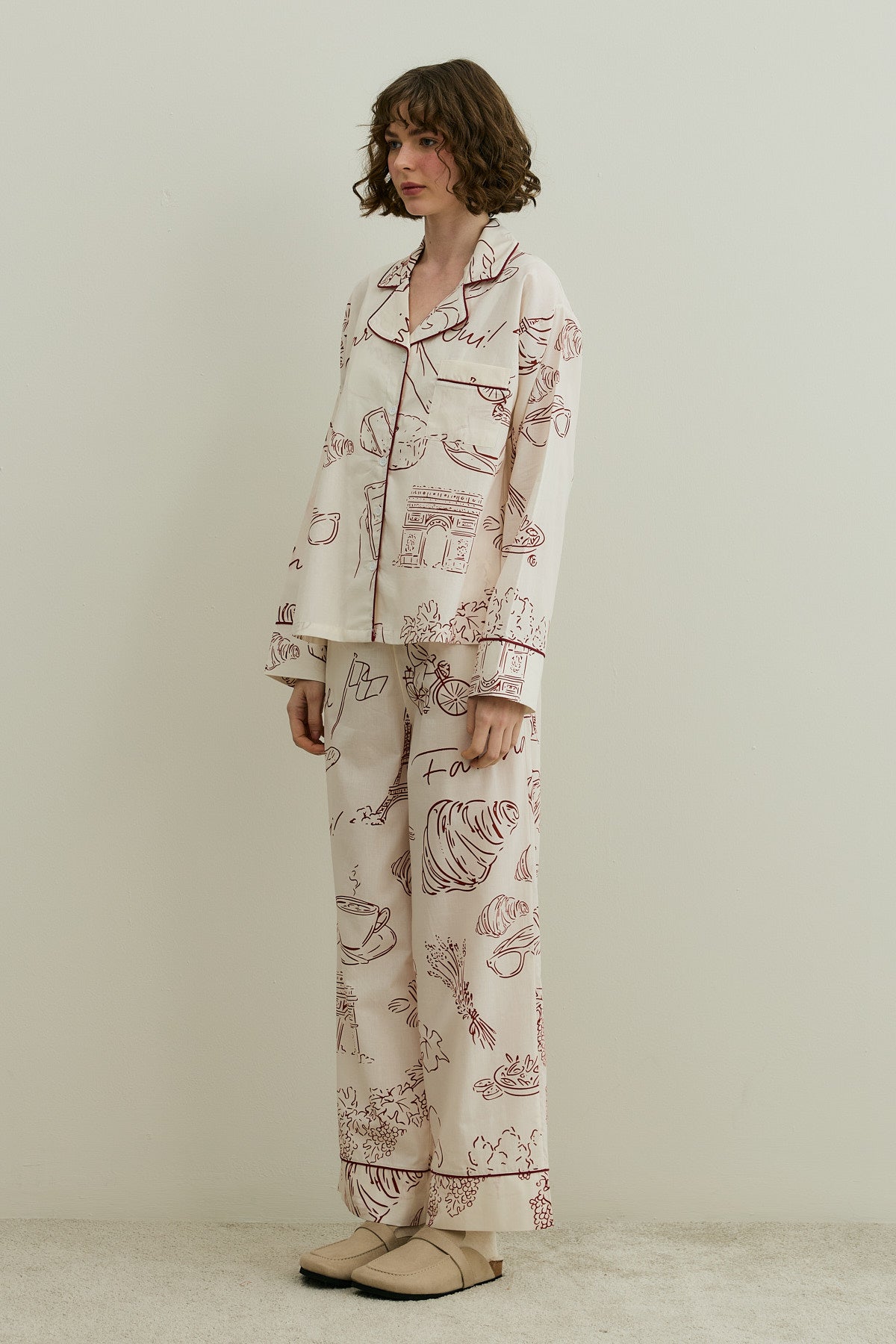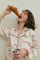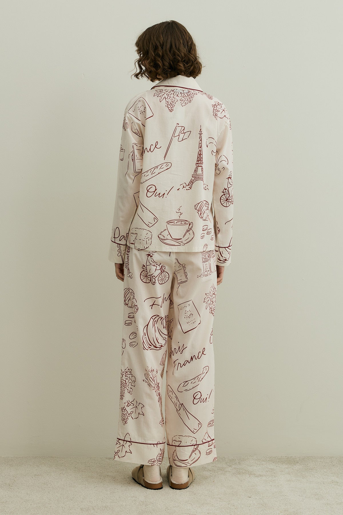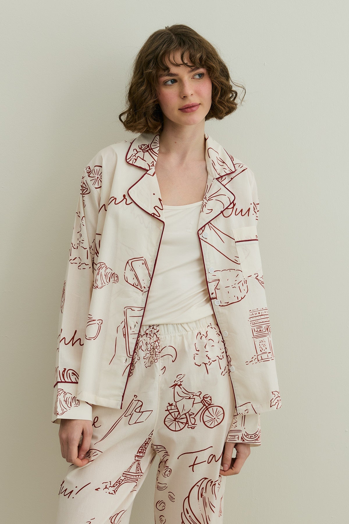 Kruvasan Desen Pamuk Pijama Takımı Ekru