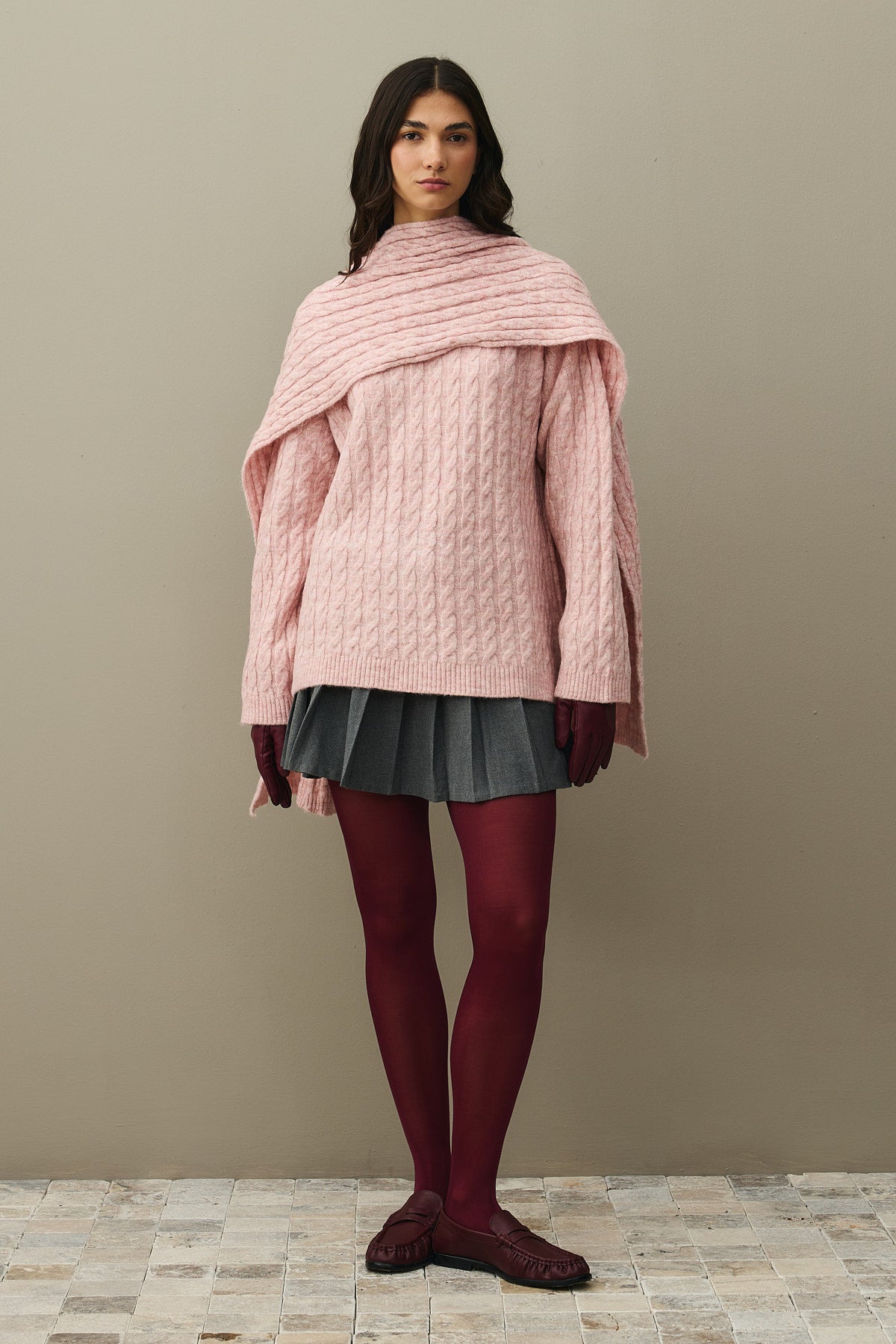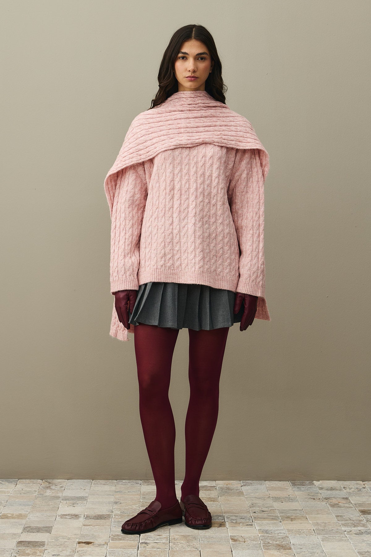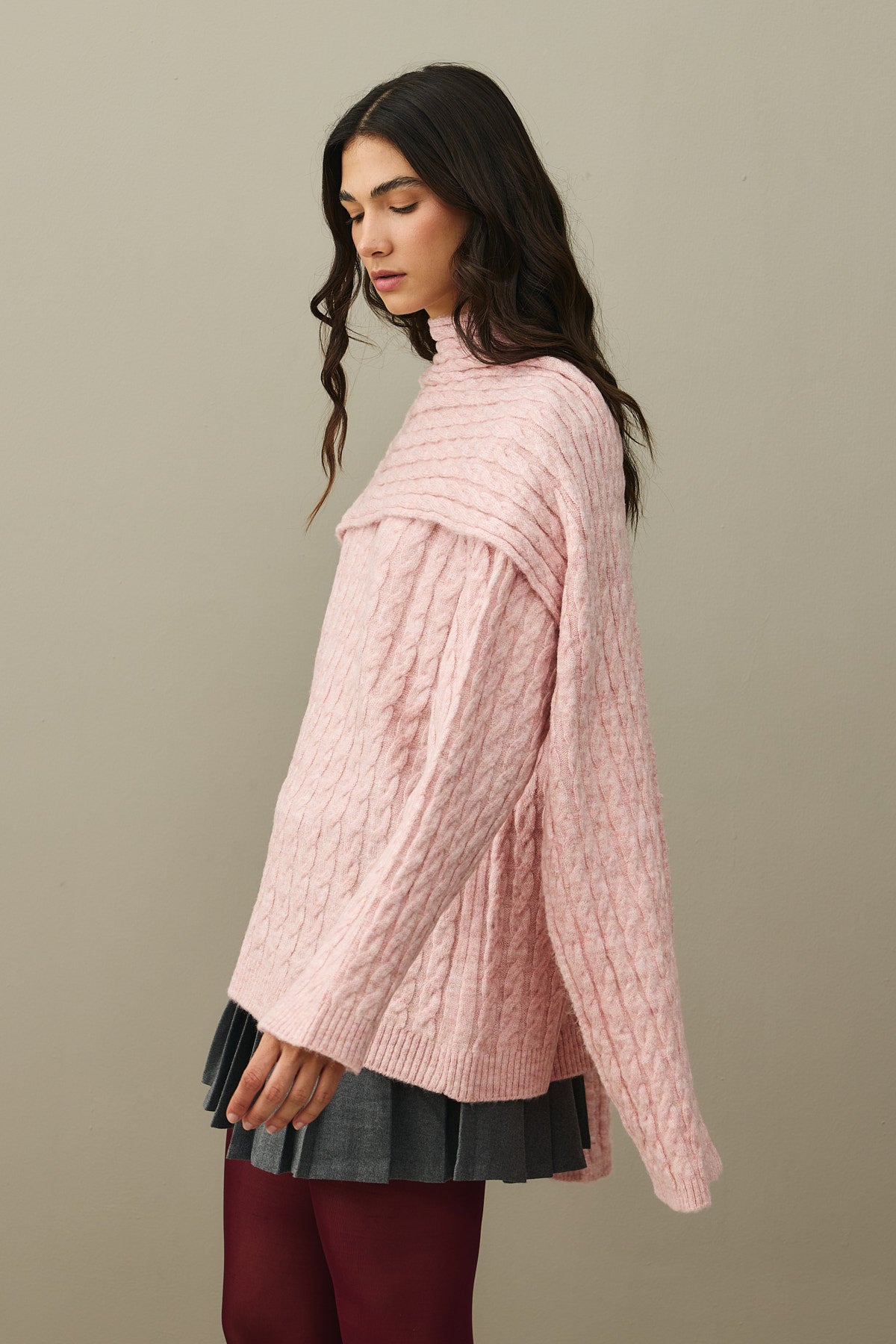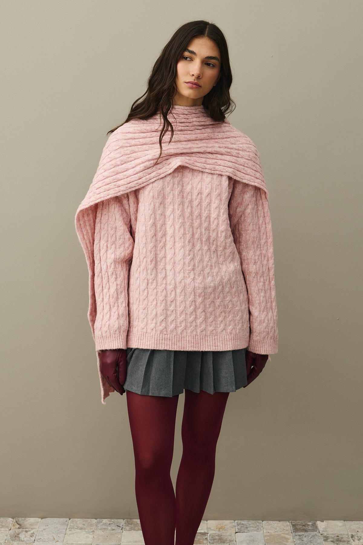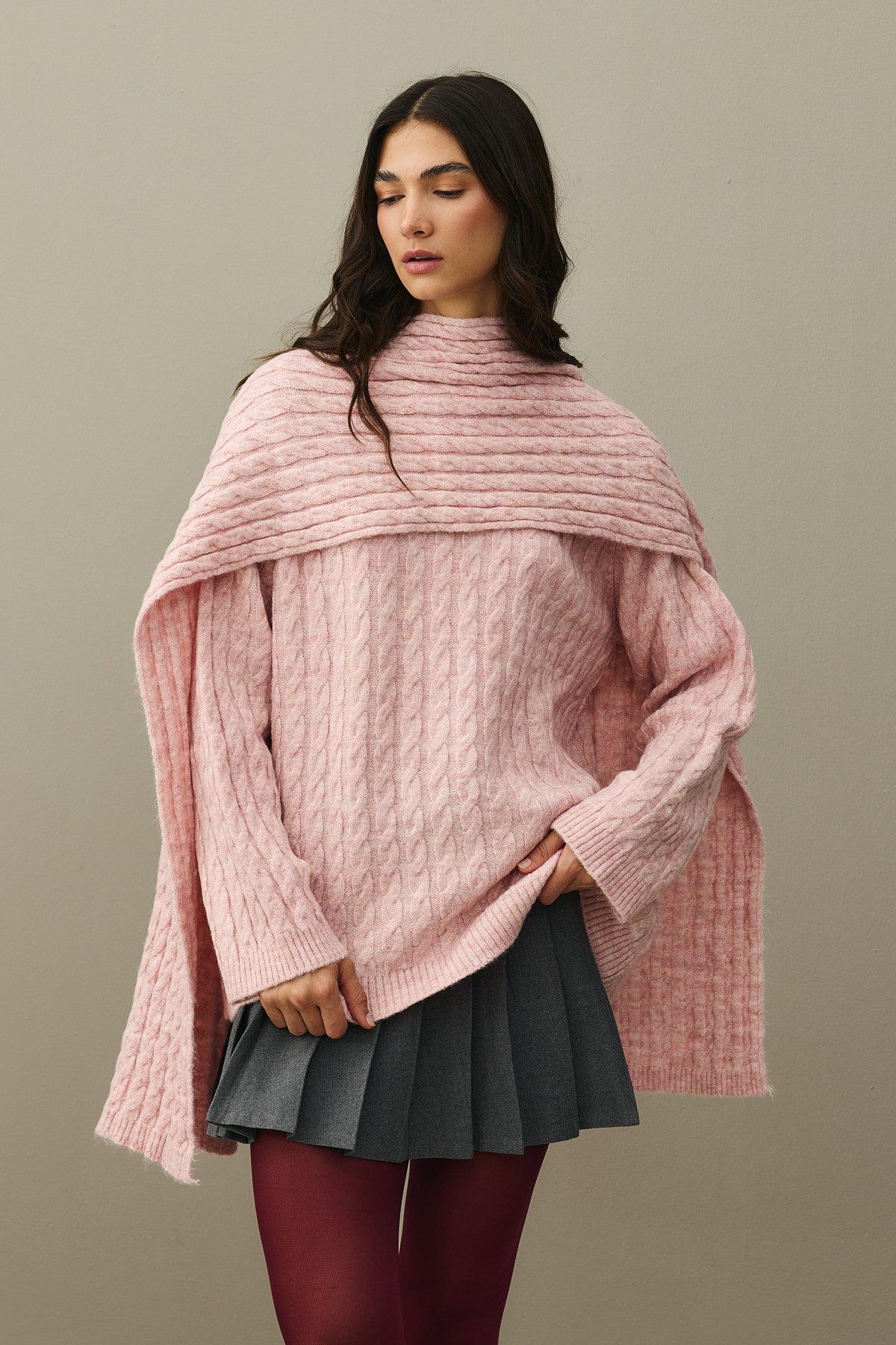 Saç Örgü Atkılı Kazak Pembe
