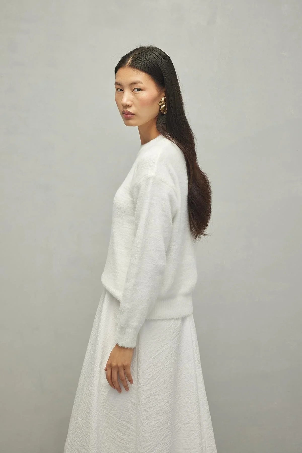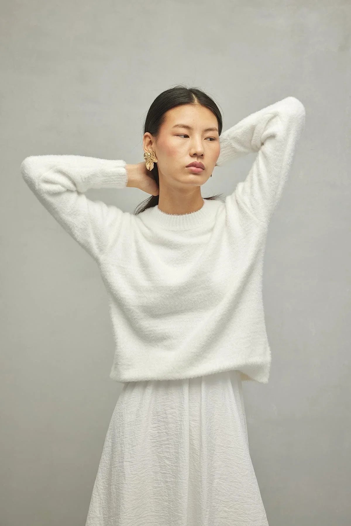 Soft, crew neck, woven knit sweater made from a mohair blend.