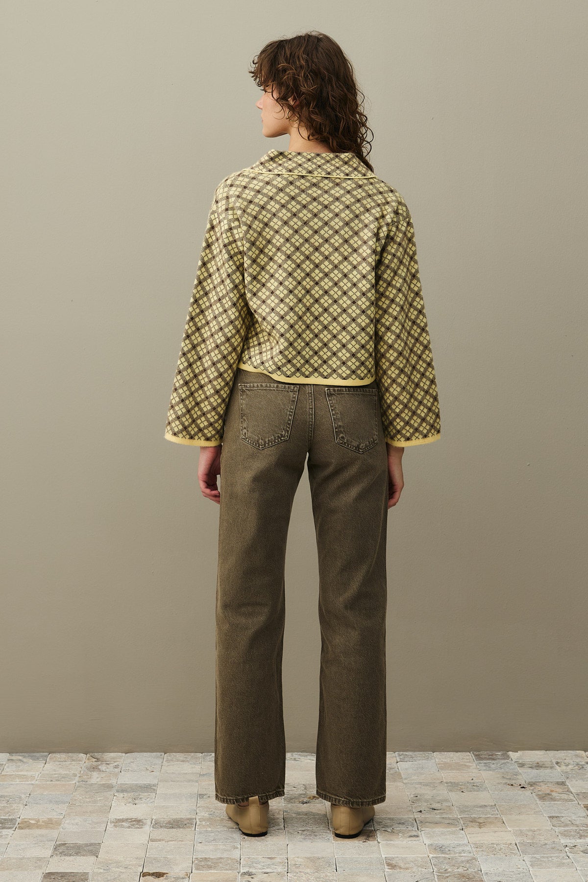 A collared, open-front, plaid-patterned, long-sleeved, raised sweater made of tight knitwear