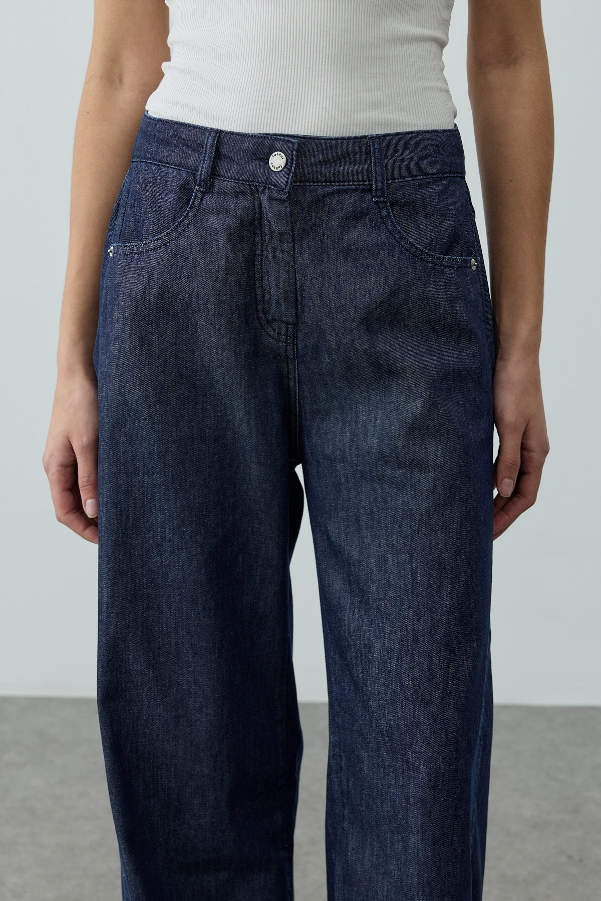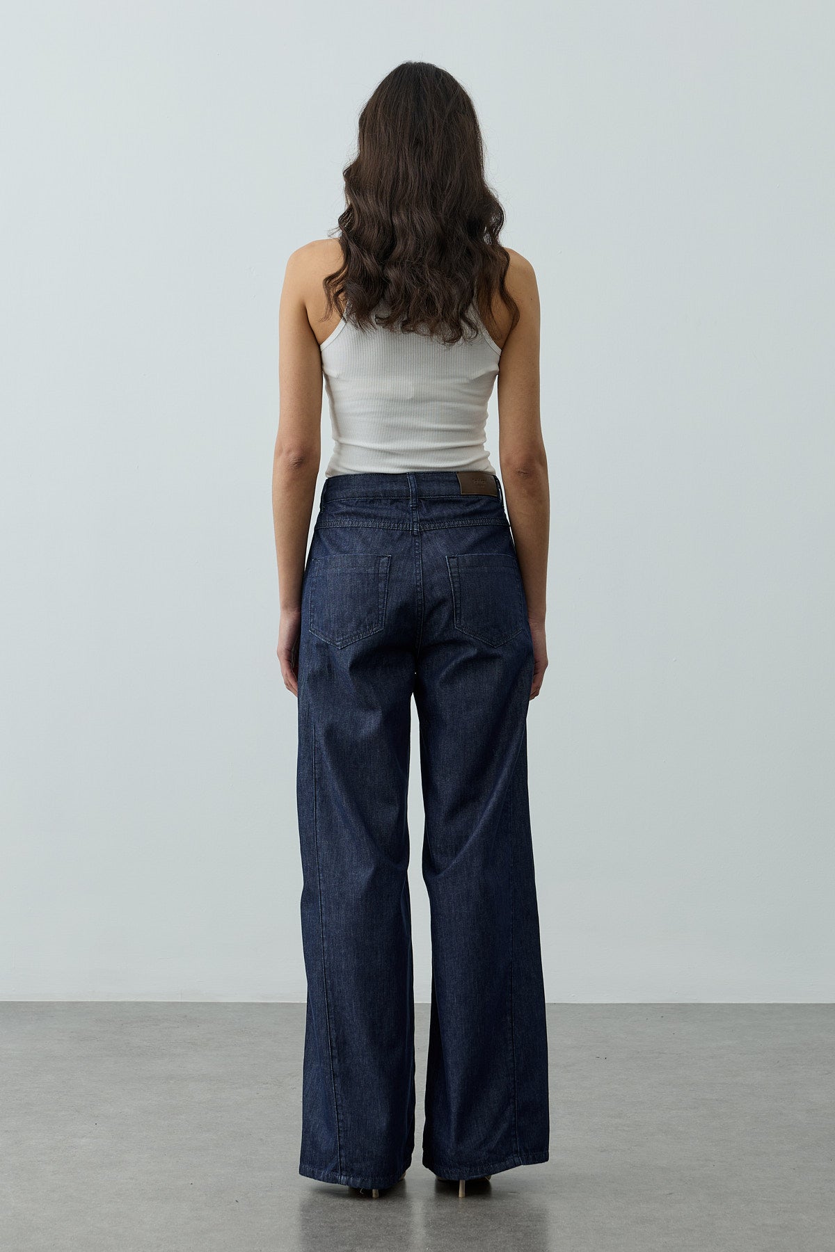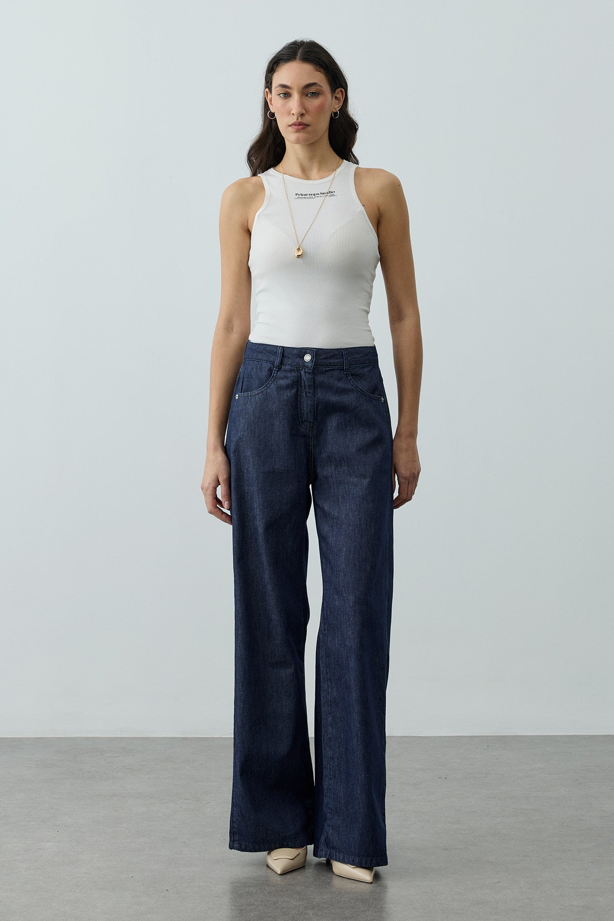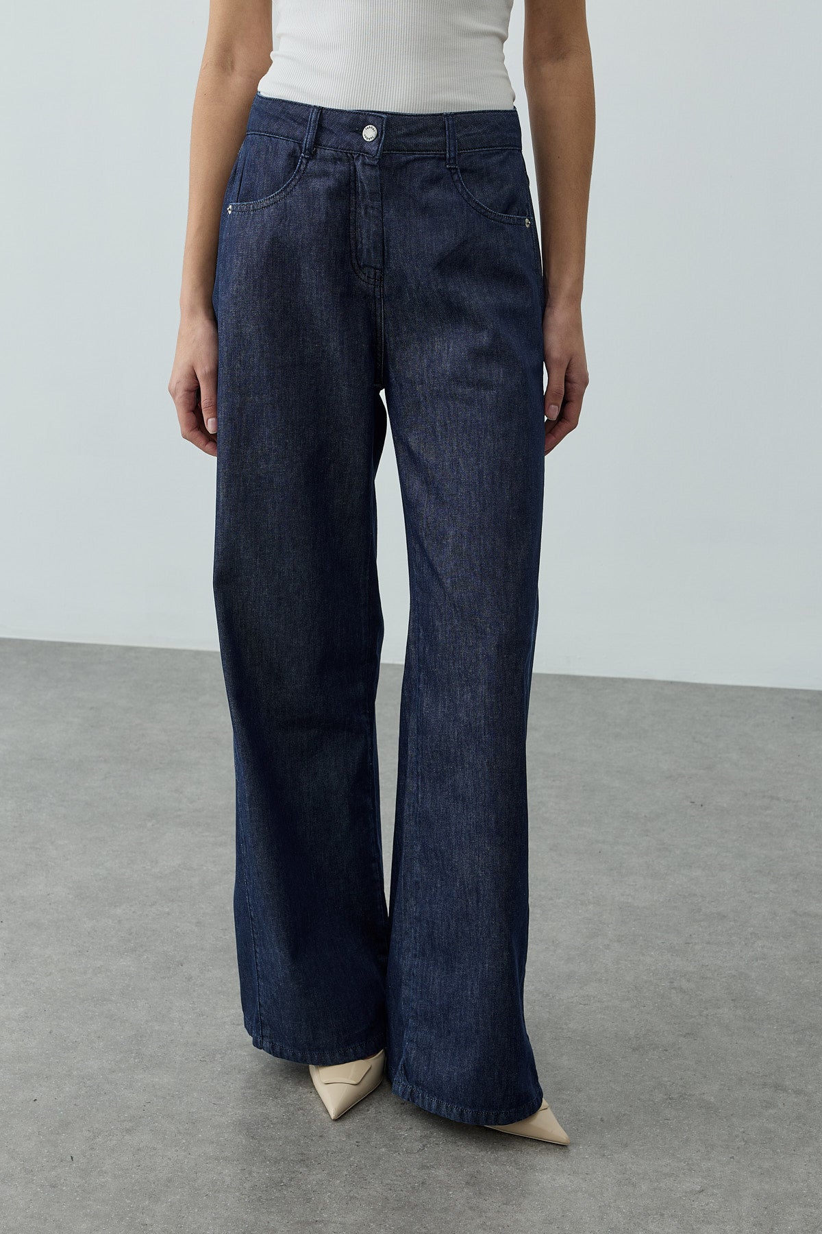 Denim dokuma kumaştan, kemer köprülü, yüksek bel, cepli, yandan yırtmaç açılım detaylı, önü fermuar ve düğme iliklemeli pantolon
