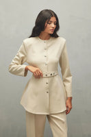 Scuba woven fabric, darted, fit, snap fastener on the front, crew neck, removable adjustable snap belt jacket and elastic waist, pockets, straight cut trousers suit.; 1 (36/38) Size: Top Length: 74 cm, Sleeve Length: 55 cm, Chest: 45 cm, Waist: 40 cm, Bottom Length: 101 cm, Waist: 46 cm, Static Waist: 30 cm, Hip: 49 cm 2 (40/42) Size: Top Length: 75 cm, Sleeve Length: 55 cm, Chest: 46 cm, Waist: 42 cm, Bottom Length: 102 cm, Waist: 47 cm, Static Waist: 33 cm, Hip: 53 cm The product has a removable belt.