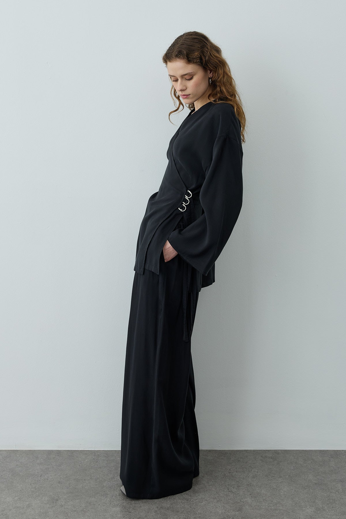 Tensel dokuma kumaştan, kimono kesim, üç brit kemerli, metal tokalı, geniş kimono kollu kimono ve beli lastikli, cepli, geniş kesimli pantolonlu takım.