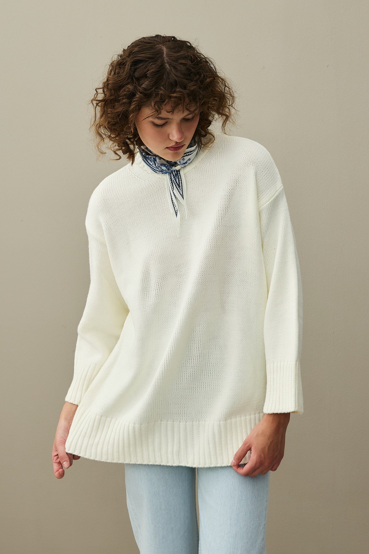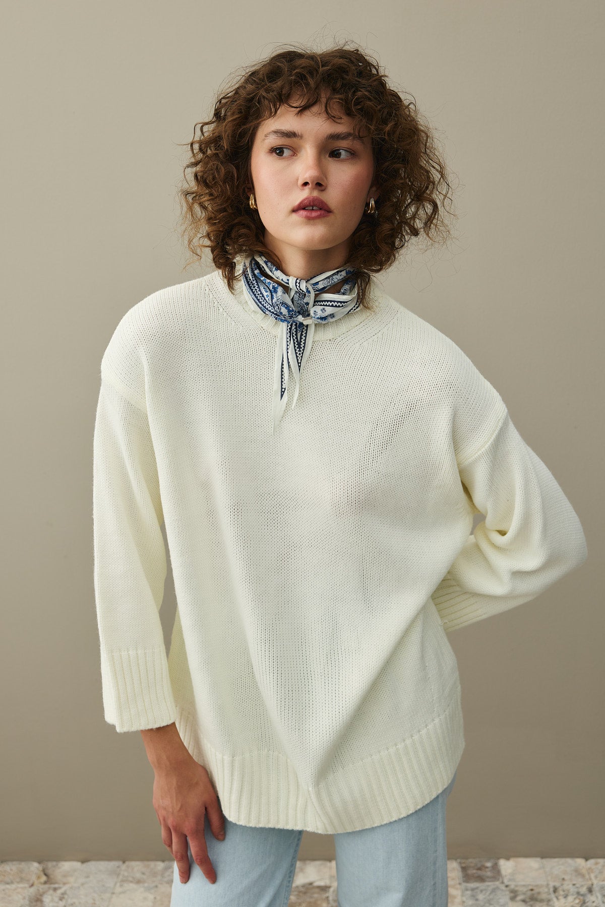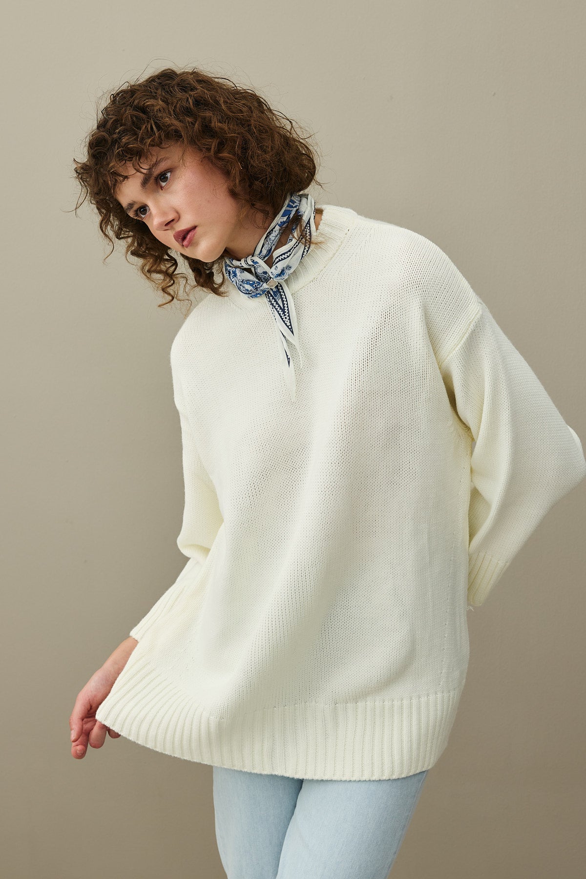 Örme trikodan, yarım balıkçı yakalı, uzun kollu, manşetleri ve etek ucu lastik örgülü, oversize kalıplı kazak