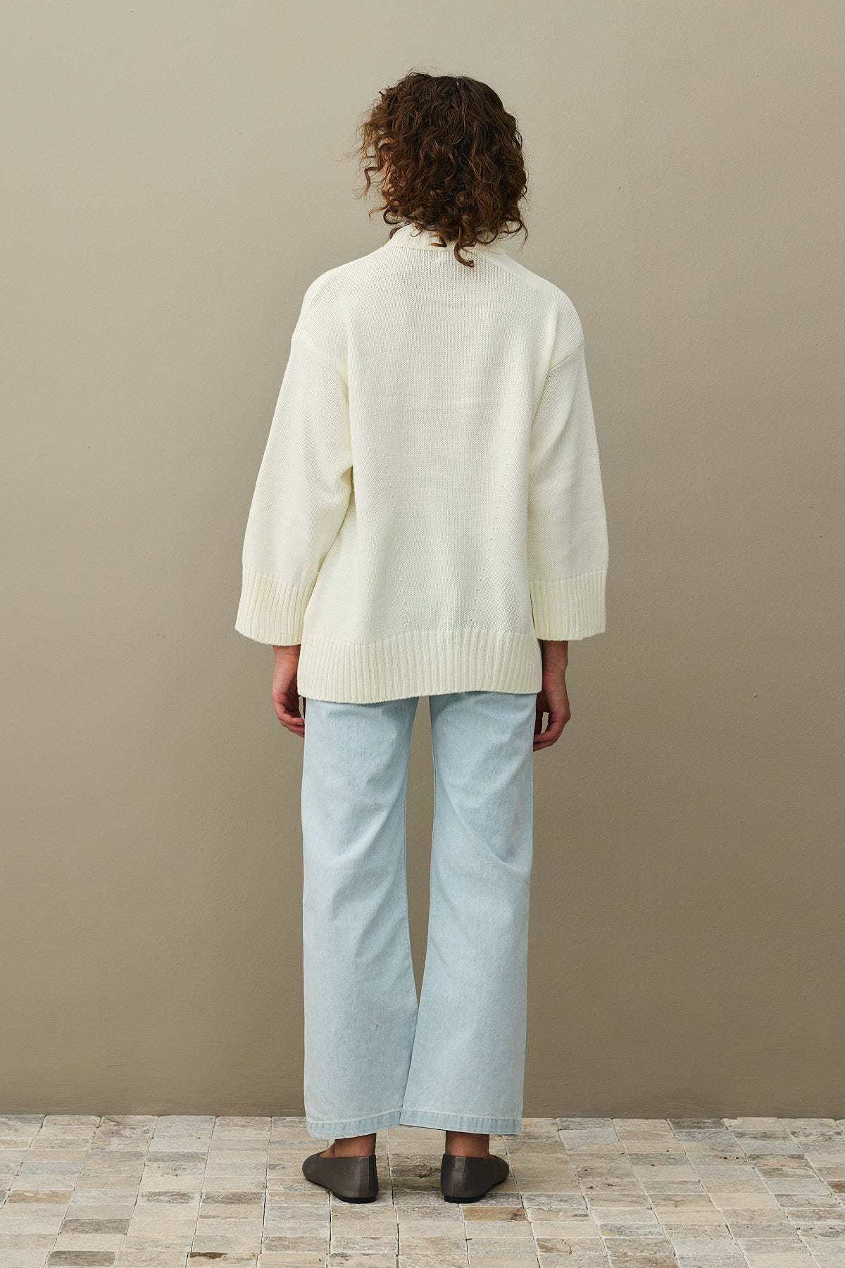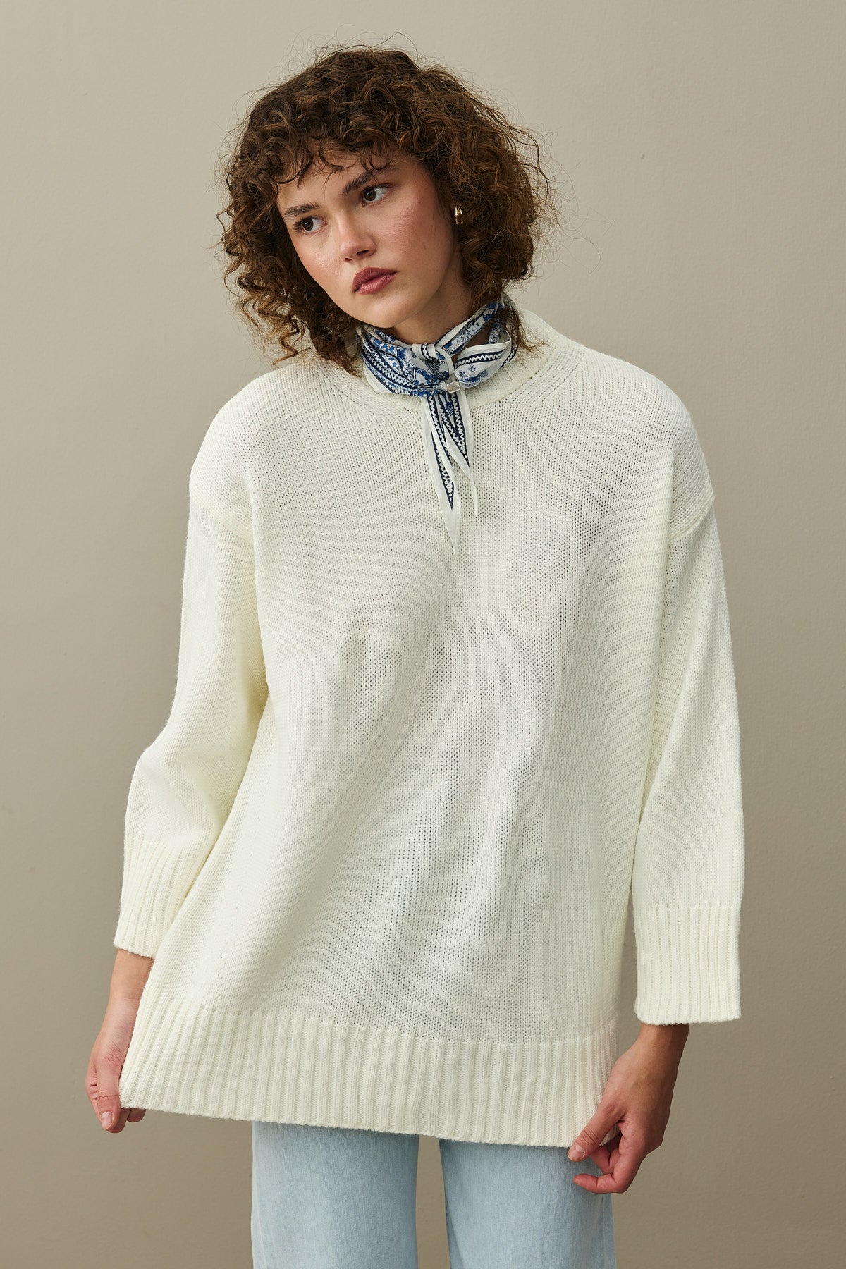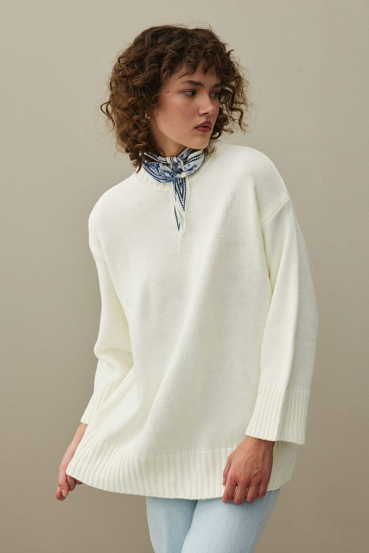 Örme trikodan, yarım balıkçı yakalı, uzun kollu, manşetleri ve etek ucu lastik örgülü, oversize kalıplı kazak