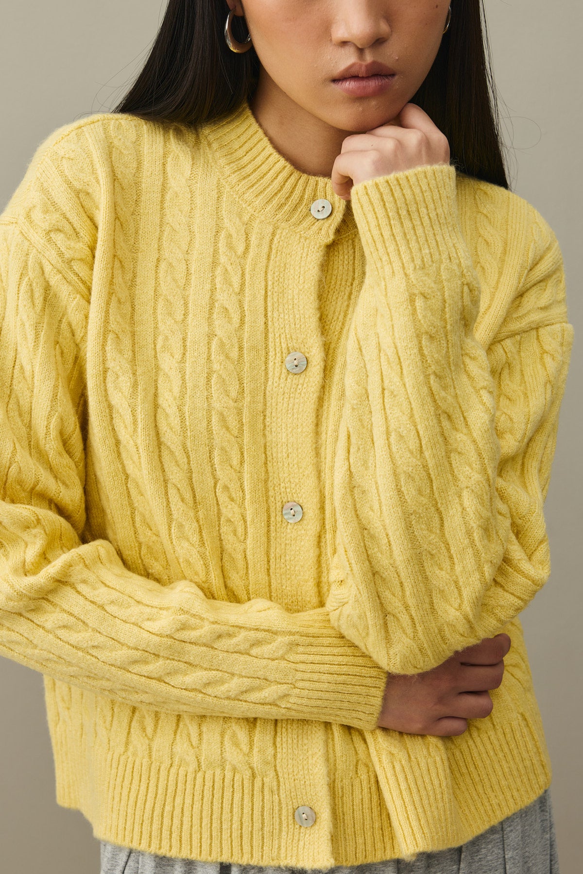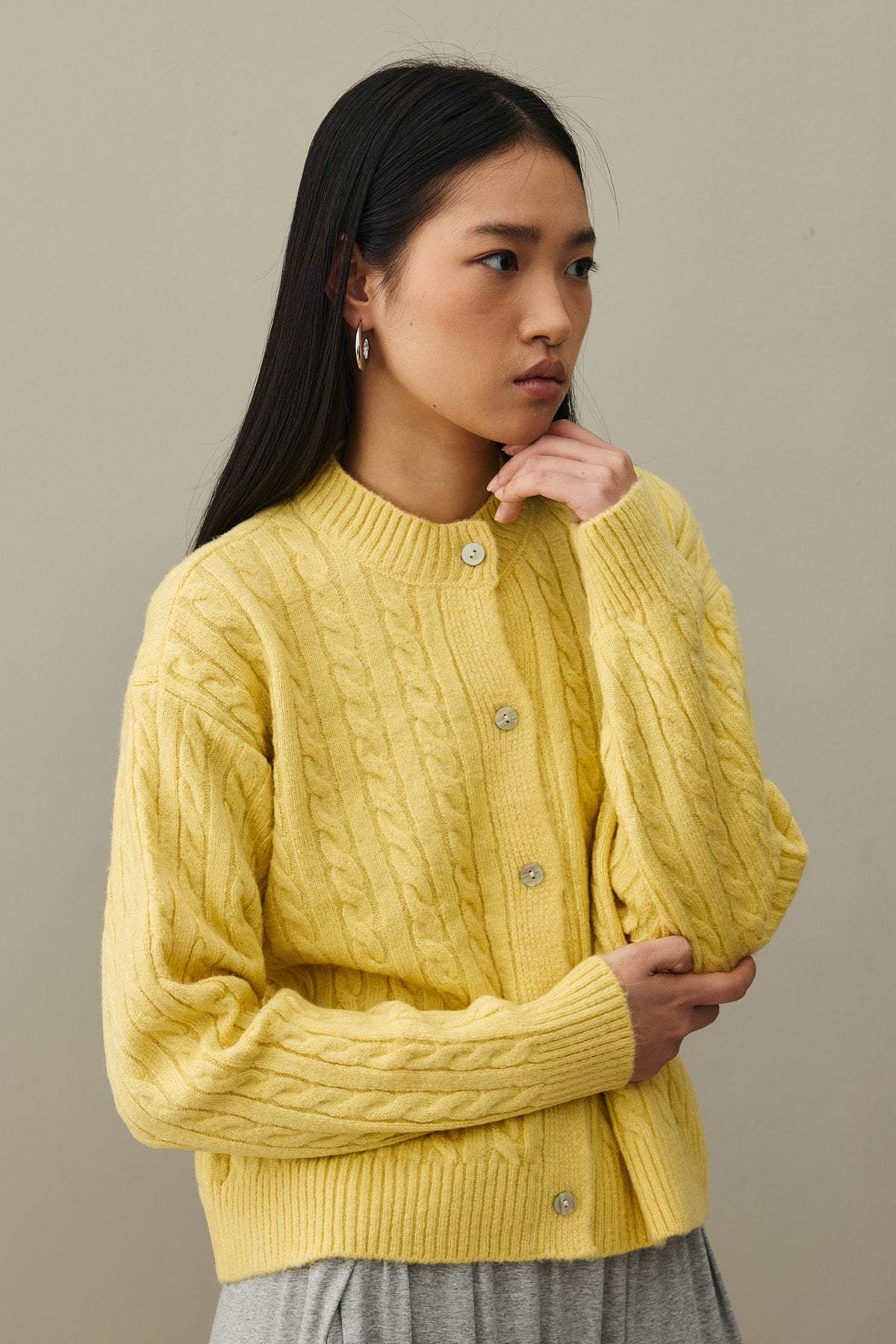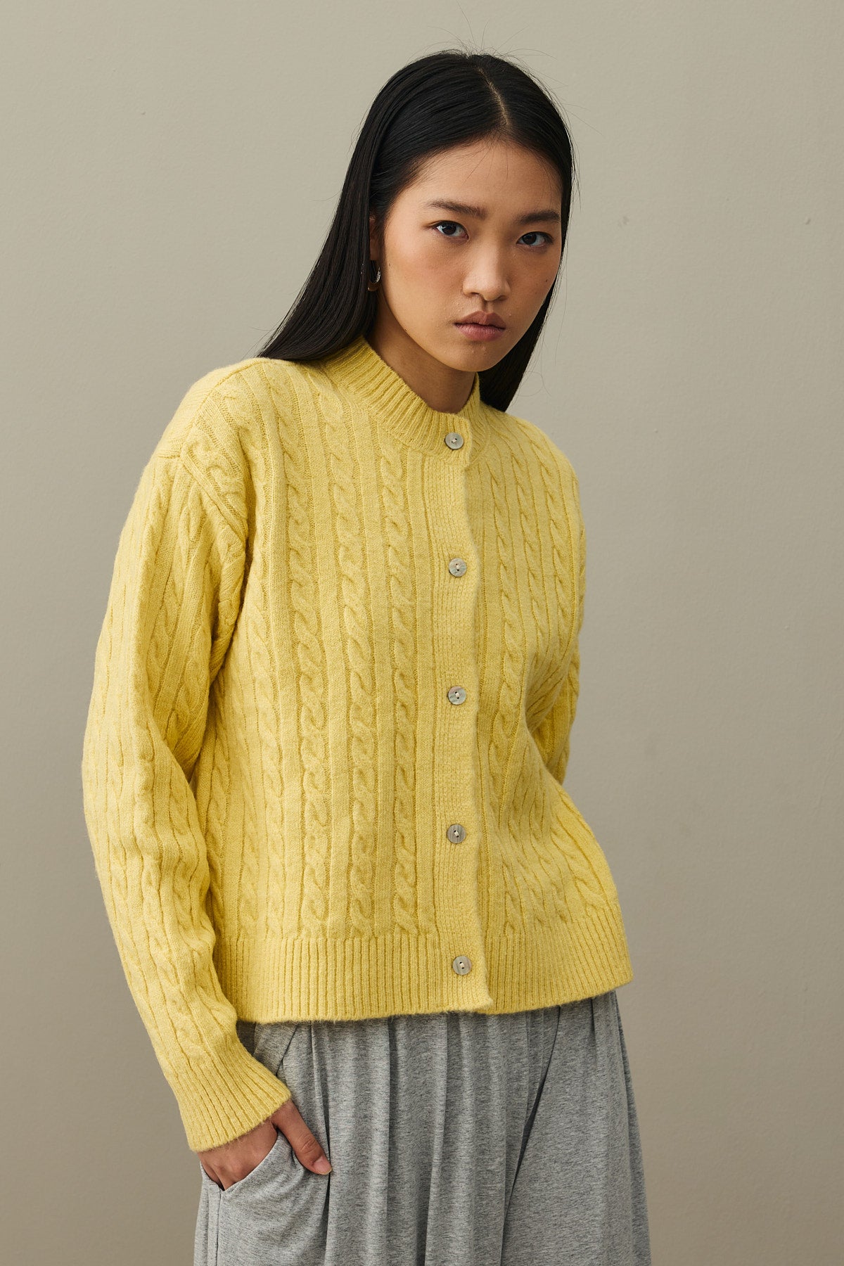 Tiftik karışımlı ipli trikodan, saç örgülü, bisiklet yakalı, uzun kollu, önü düğme kapamalı hırka