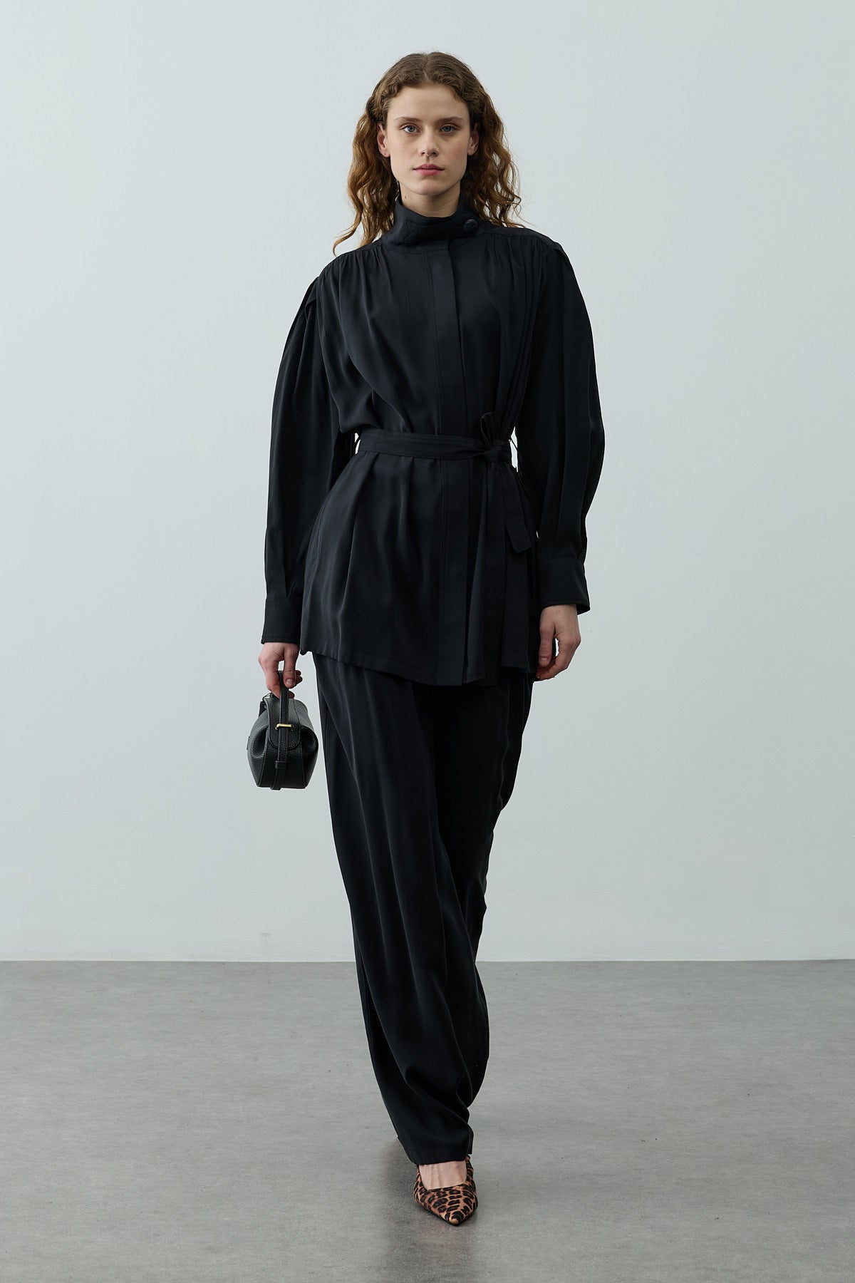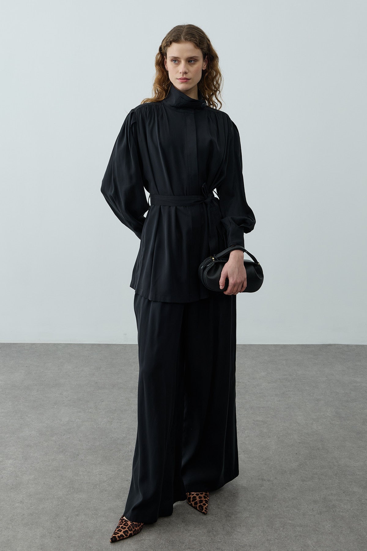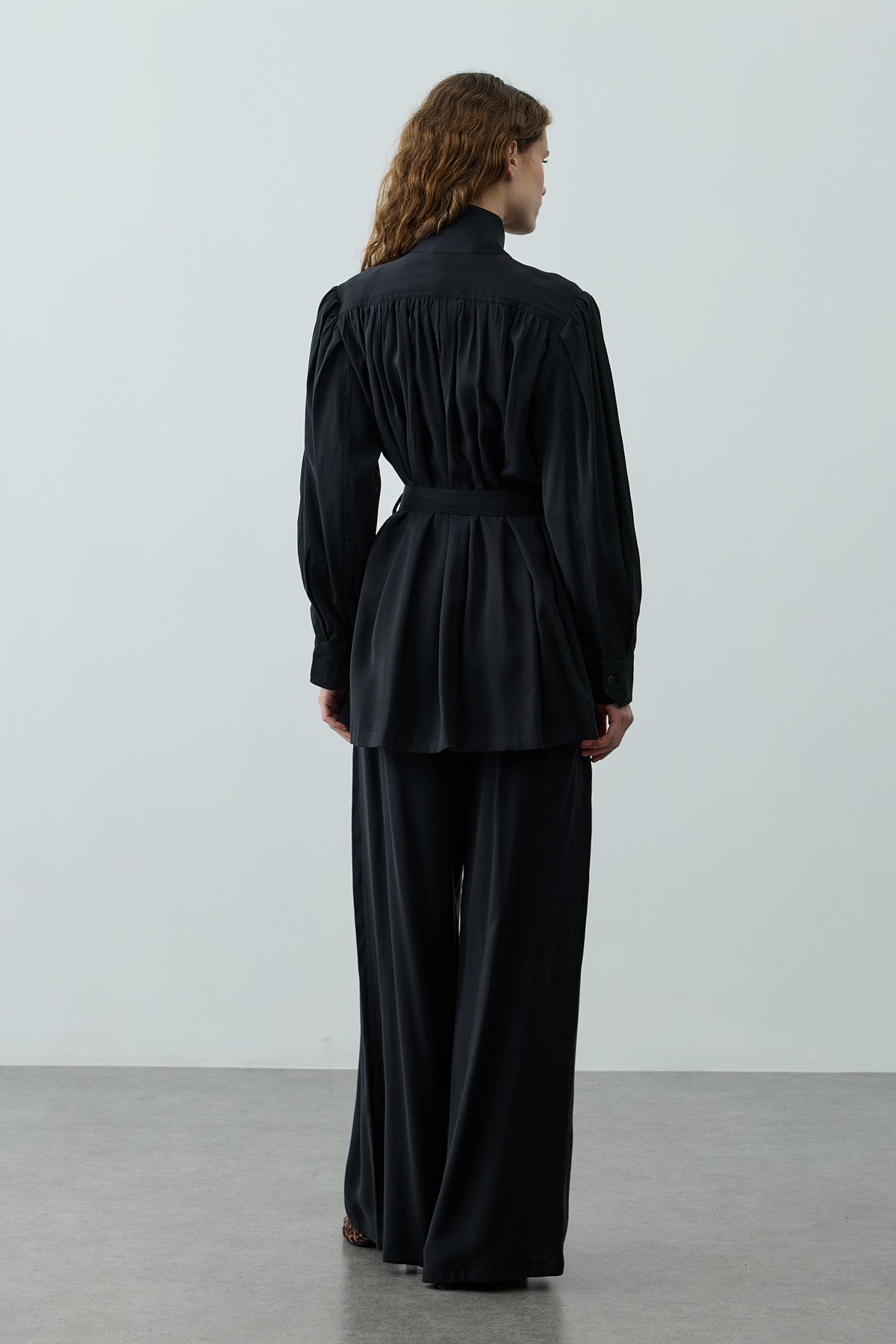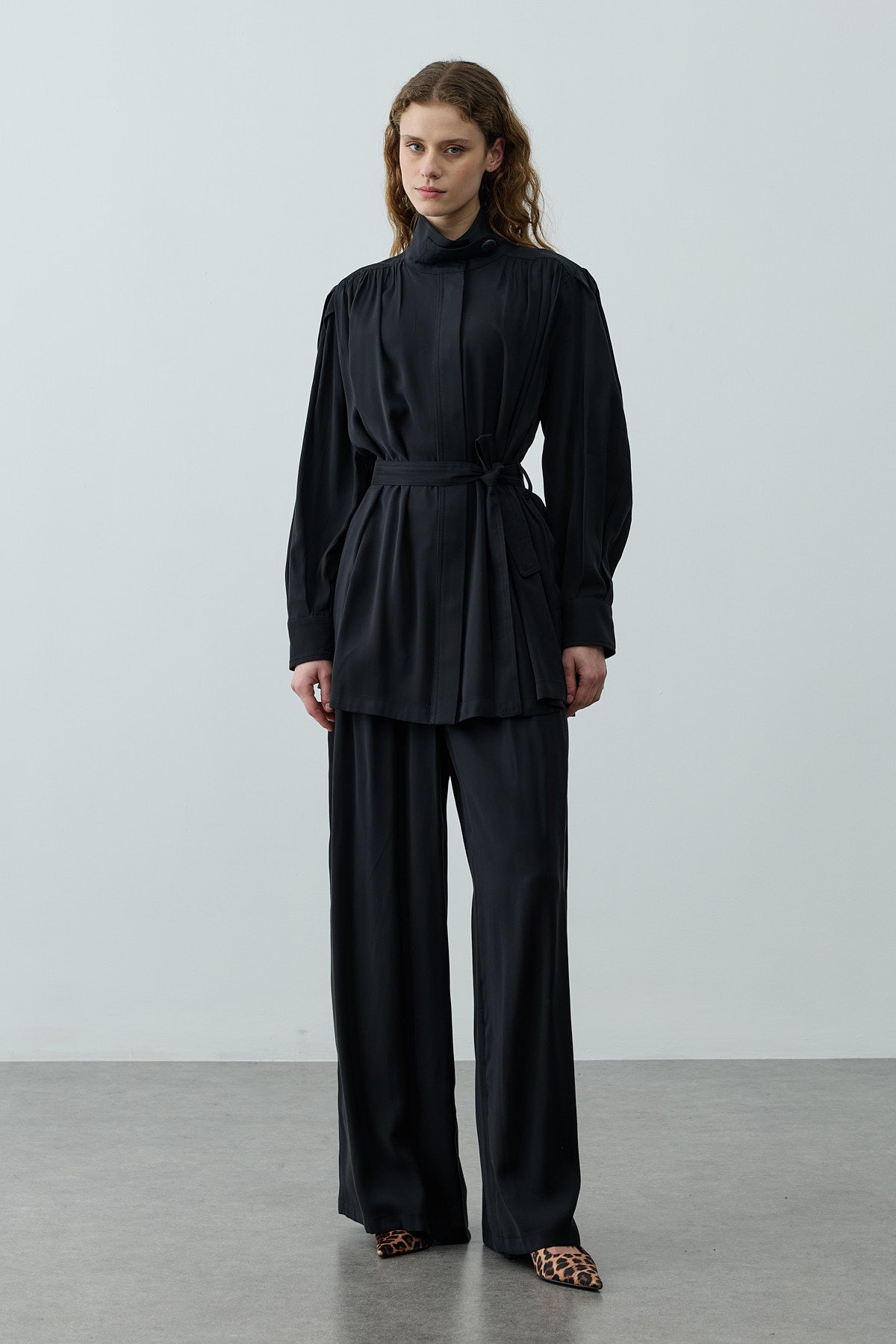 Tensel dokuma kumaştan, dik yakalı, önü düğme kapamalı, uzun kollu, manşetli, seyyar kemerli, cepli gömlek ve fermuarlı, düğme kapamalı, pileli, palazzo kesim pantolon takım.