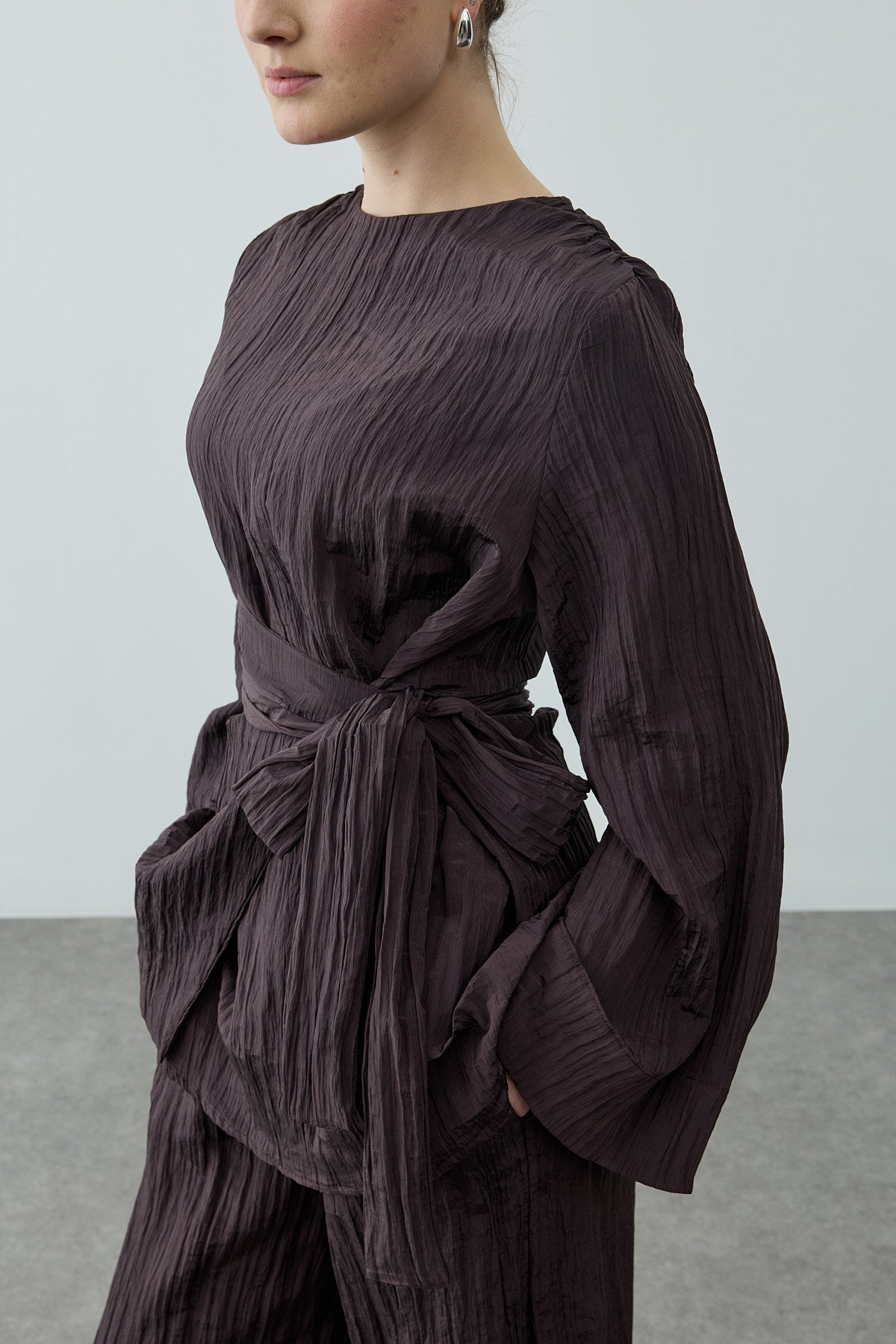 Kıraşlı parlak dokulu dokuma kumaştan, bisiklet yakalı, sırtı fermuar kapamalı, uzun kollu, geniş kemer detaylı üst ve beli lastikli, cepli, palazzo kesim pantolonlu takım.