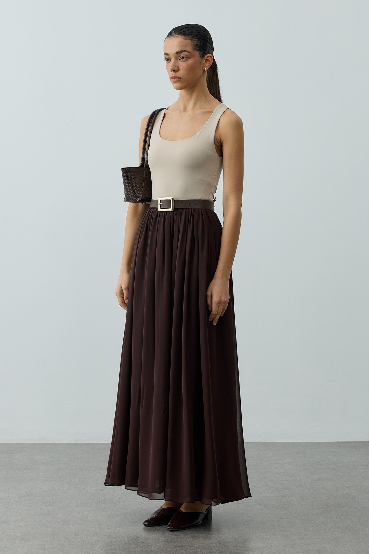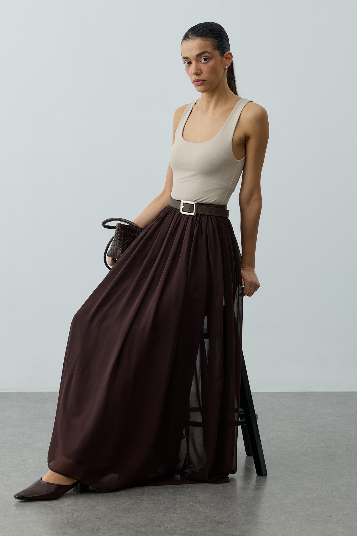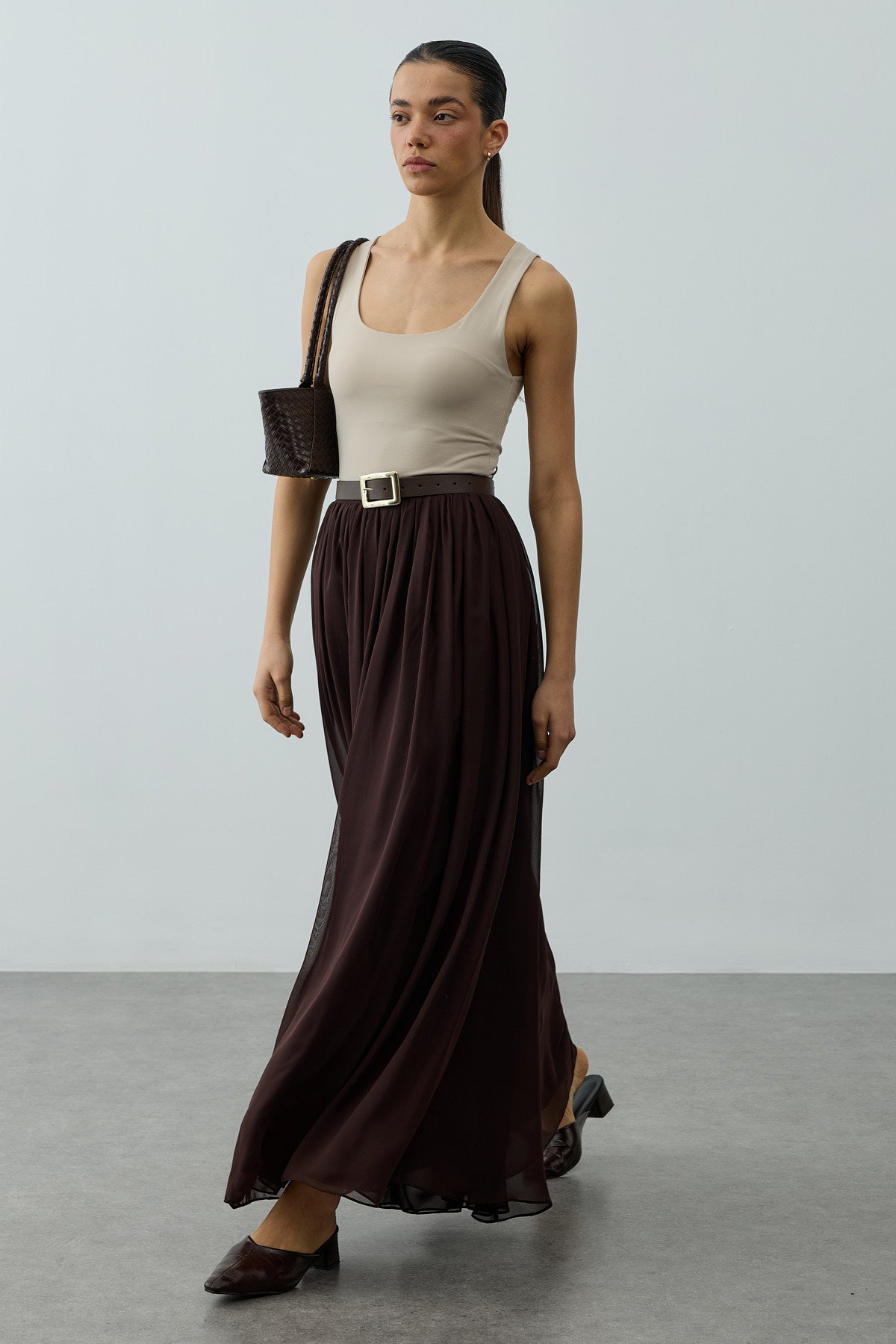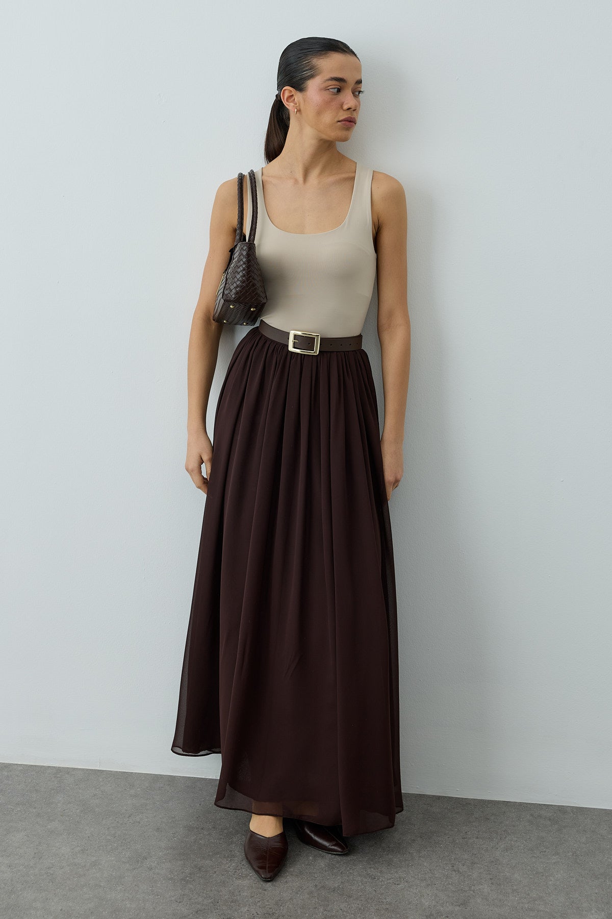 Büzgülü Dökümlü Maxi Etek Kahverengi