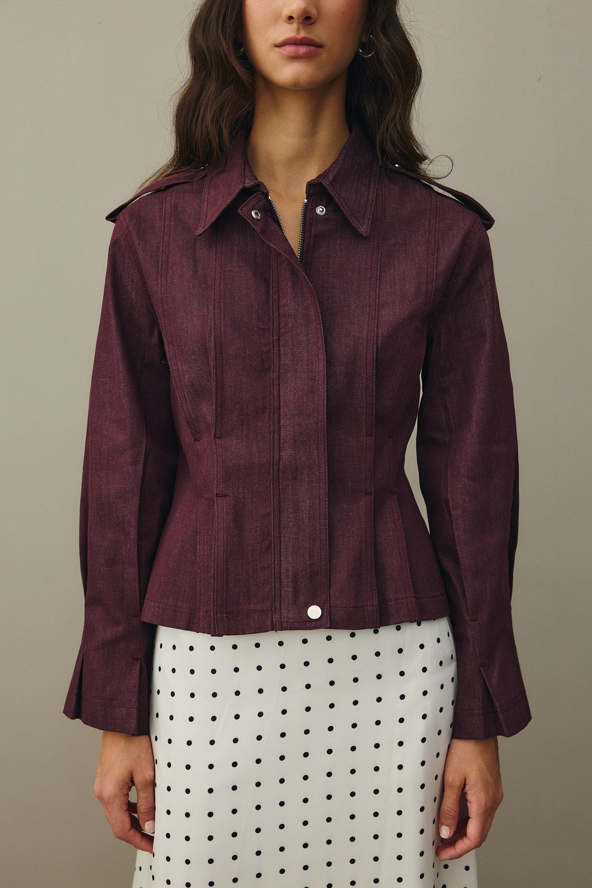 Denim woven fabric jacket with epaulette details on the shoulders, long sleeves, cuffs, darts on the body, collar, front zipper, placket, snap fastener