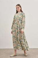 Hakim yakalı, arkadan fermuarlı, beli ince lastikli, ince manşetli, seyyar kemer detaylı, özel pigment boyalı %100 pamuk viscone dokuma kumaştan elbise.