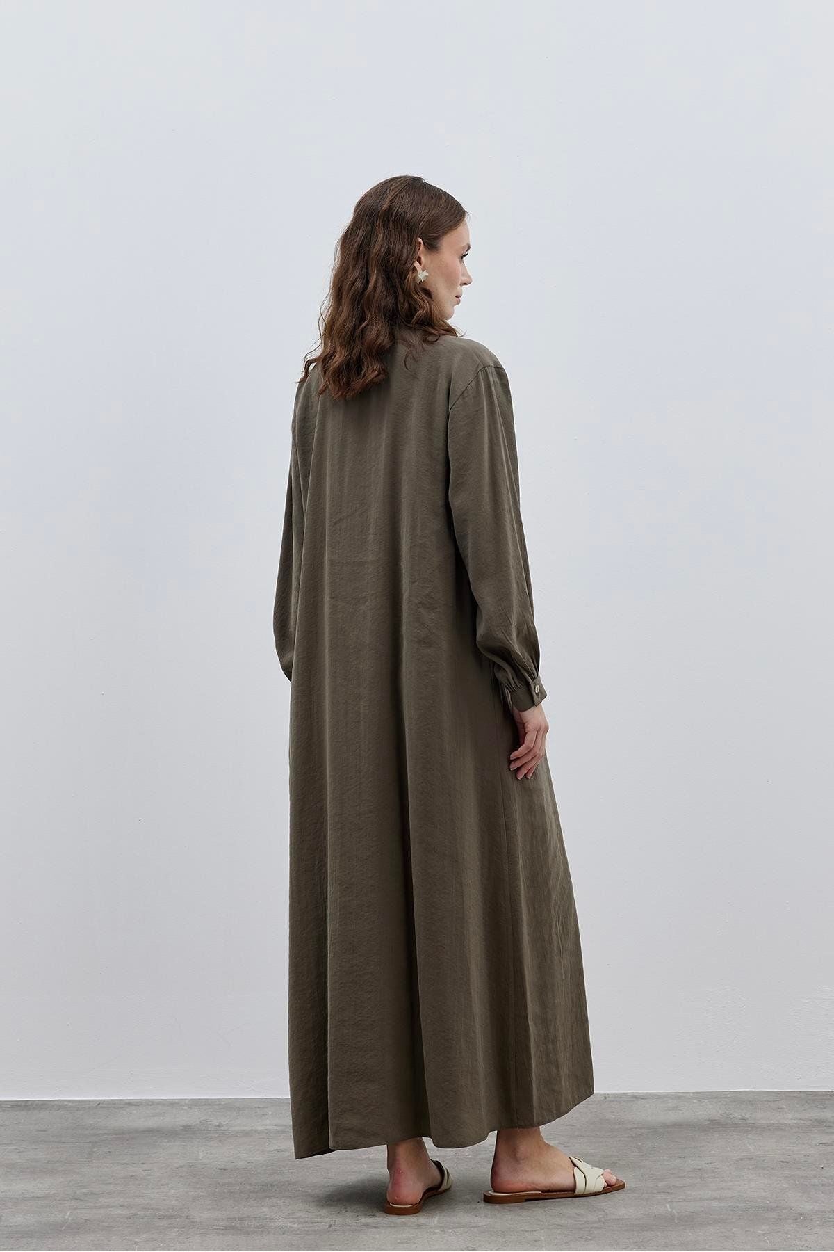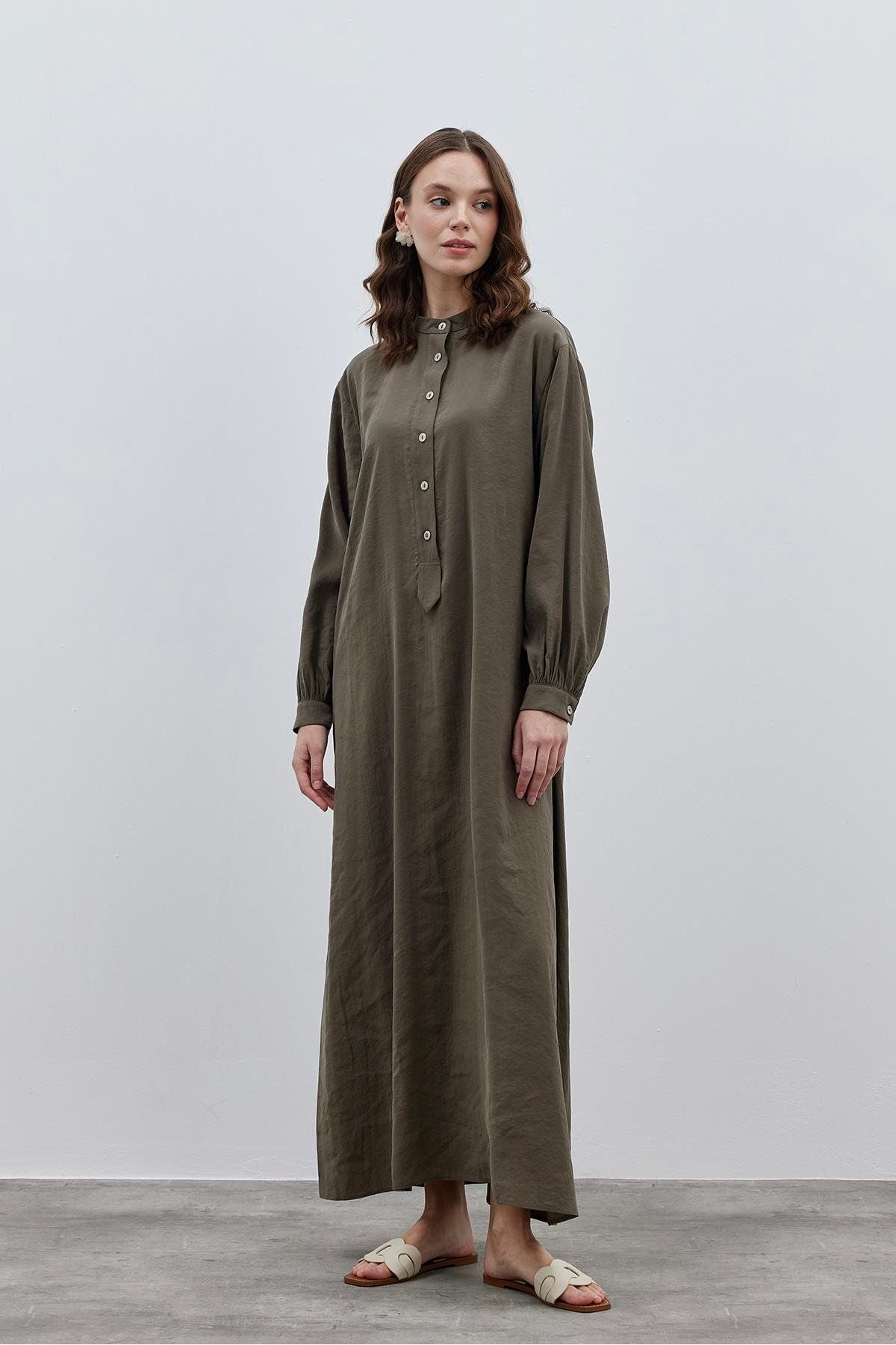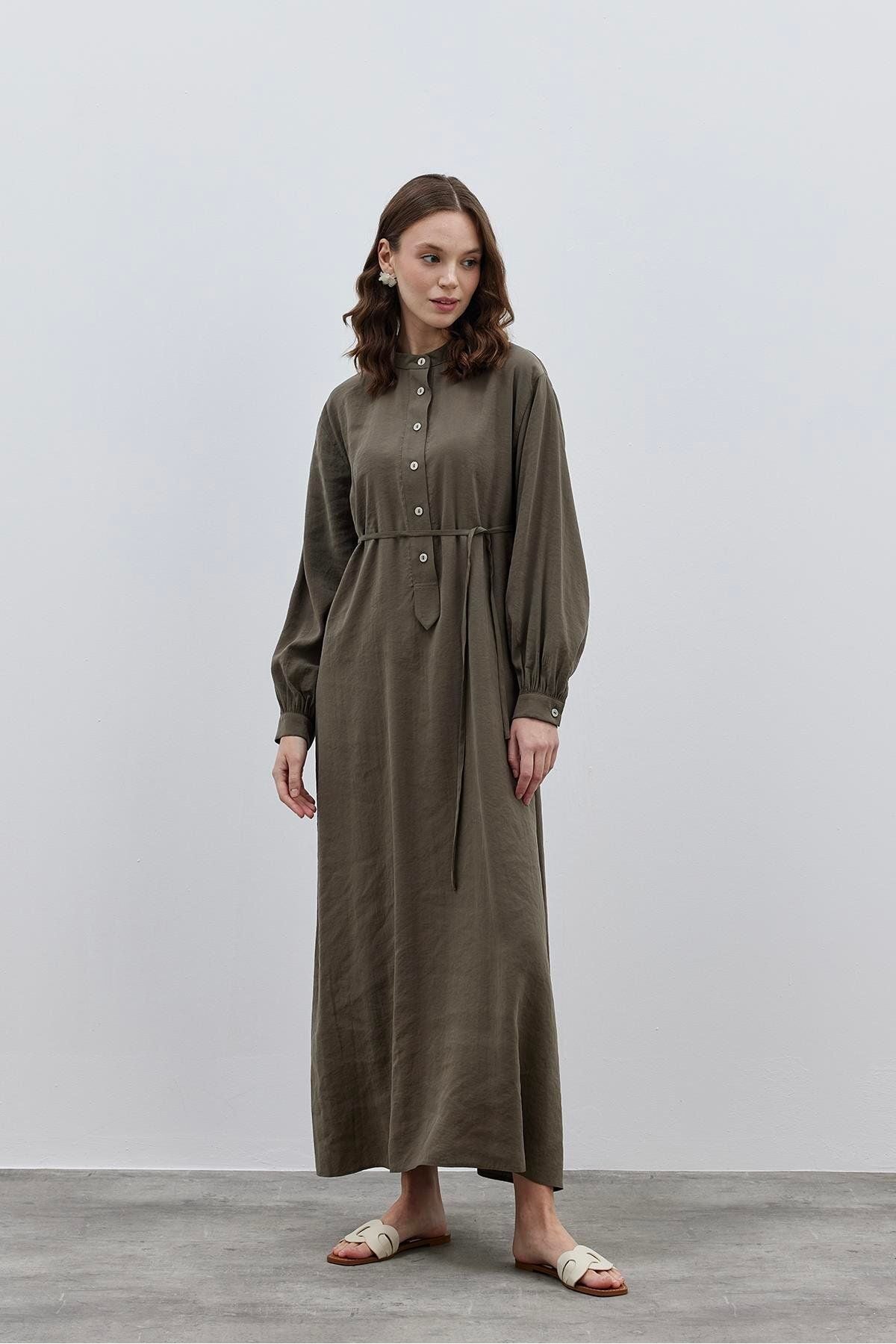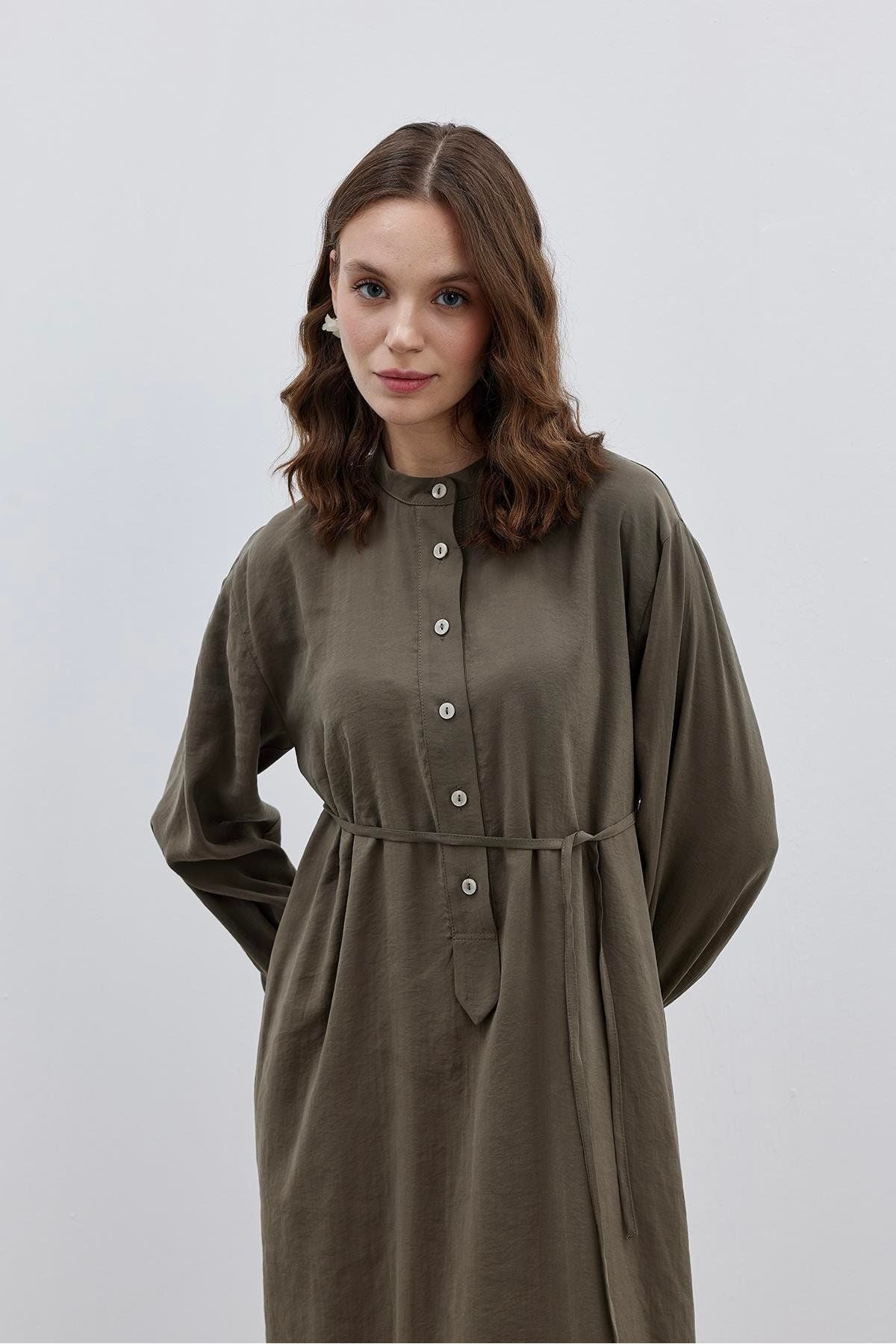 Patlı Modal Gömlek Elbise Haki